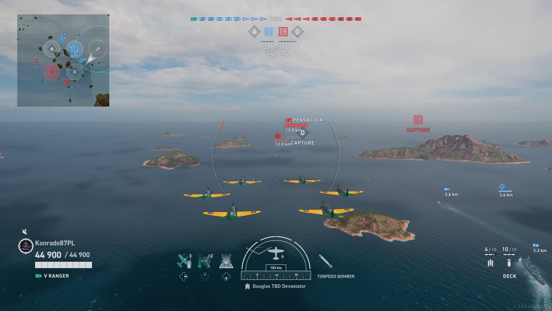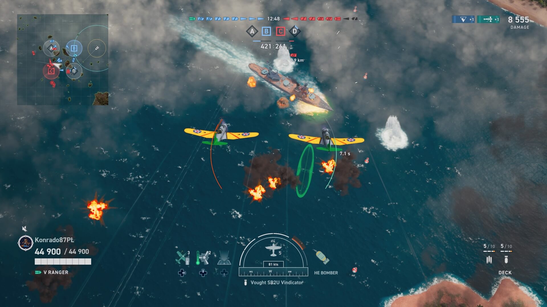 Sterowanie samolotami wcale do trudnych nie należy, naciskając R2 lub RT startujemy eskadrą składającą się z 6 samolotów, lewym analogiem skręcamy oraz manipulujemy przepustnicą, prawy analog służy tylko do obracania kamery. Cel atakujemy również przytrzymując R2 lub RT, na raz mogą atakować tylko dwa samoloty, czyli w jeden okręt wysyłamy dwie torpedy lub dwie bomby zapalające. Większość pancerników i krążowników ma bardzo moce działa przeciwlotnicze o dużym zasięgu, więc każdy atak może wiązać się ze stratą kilku samolotów w eskorcie.