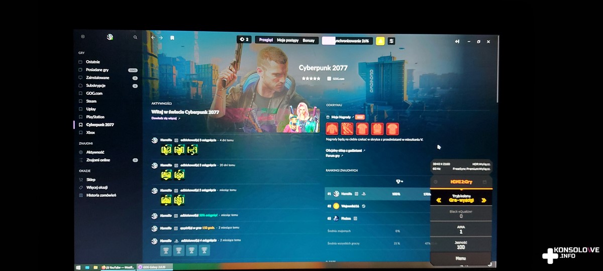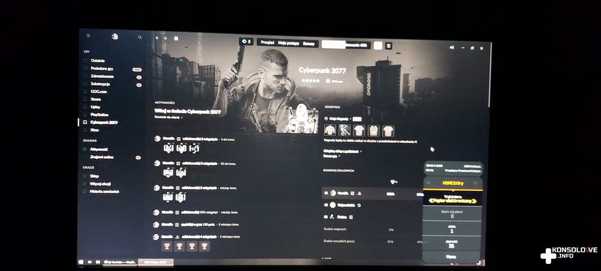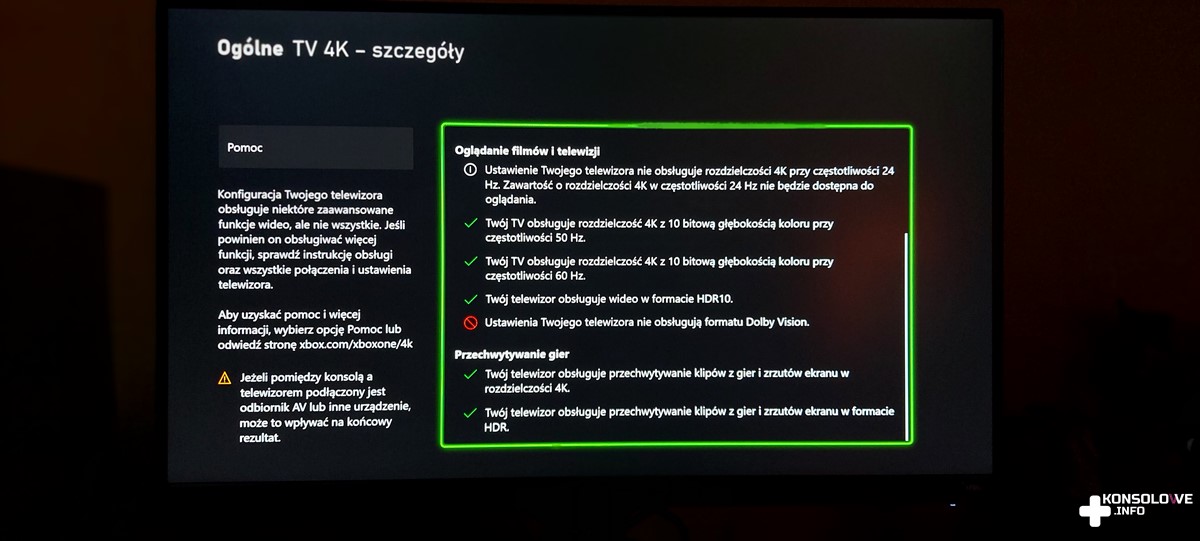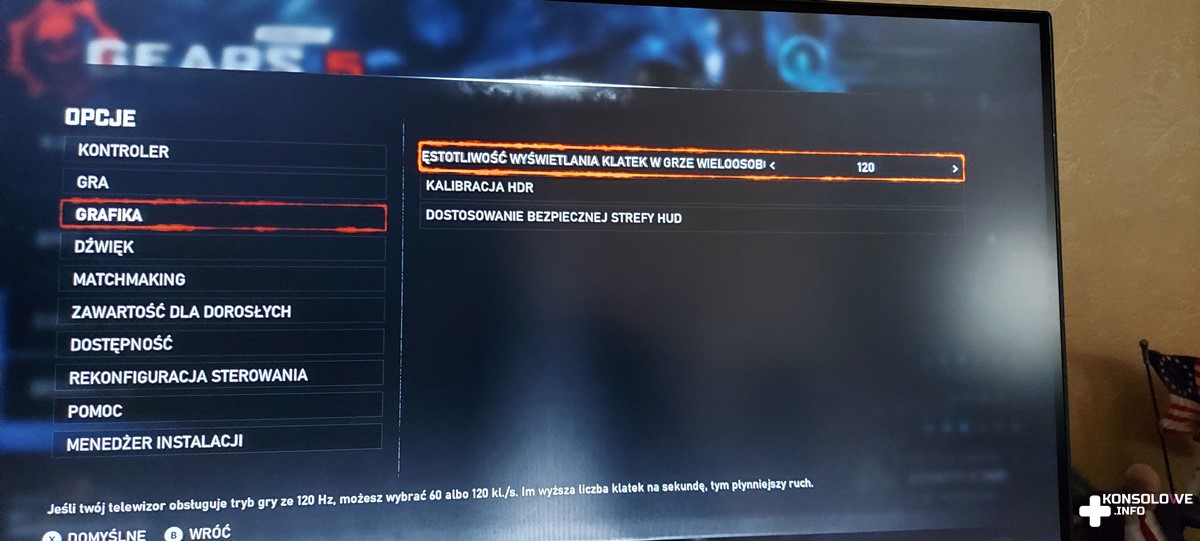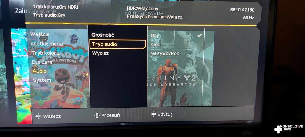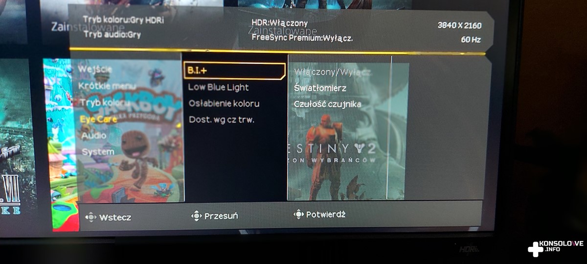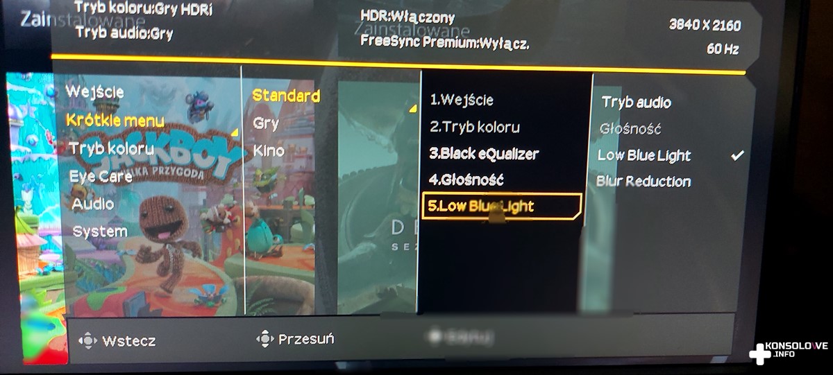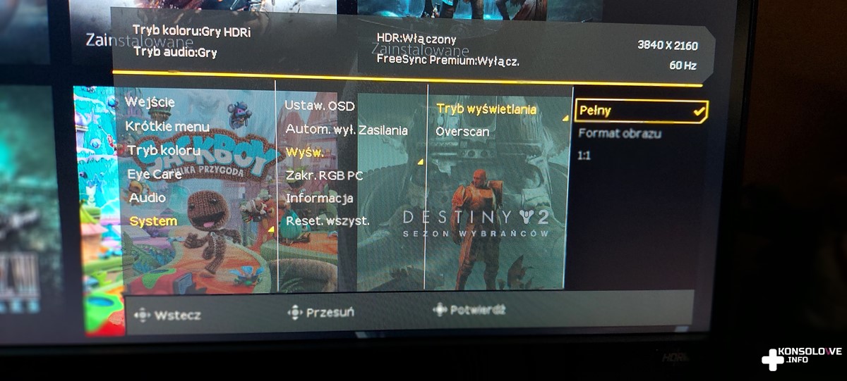 Zaletą jest natomiast wyświetlanie w rozdzielczości 4K. Oczywiście w takim przypadku zagramy w 60 klatkach. 120 FPS wymaga zmniejszenia rozdzielczości obrazu, co nie powinno nikogo dziwić. Możemy także wybrać kilka predefiniowanych ustawień koloru obrazu, a więc na pewno każdy znajdzie coś dla siebie. Niektóre z nadmienionych opcji możecie obejrzeć poniżej.
