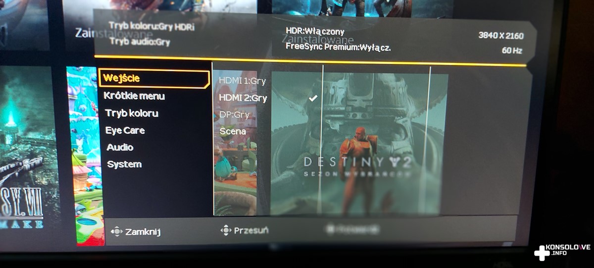 • Wejście – tu wybierzemy port, z którego chcemy widzieć obraz. Oczywiście można też po prostu włączyć sprzęt, aby monitor automatycznie aktywował odpowiednie gniazdo, więc nie musicie się nawet zajmować ręcznym zmienianiem źródła.