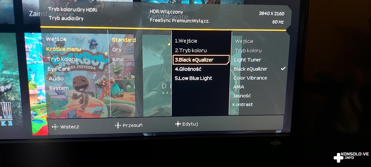 Bardzo dobrze przemyślanym rozwiązaniem jest również znajdujący się na froncie monitora przycisk iHDR. Dzięki niemu szybko możemy się przełączać między poszczególnymi trybami HDR: Kino iHDR, Gry iHDR, HDR oraz Wyłączony. Warto zaznaczyć, że nie zawsze gry wyglądają najlepiej z włączonym Gry iHDR. Bywało, że lepsze efekty przynosiło aktywowanie Kina iHDR. Analogicznie jest oczywiście z filmami. Jednak dzięki temu, że dostęp do przełączania tych trybów jest tak prosty i szybki, nie ma problemów z wygodnym i błyskawicznym zdecydowaniu się na jeden z nich. Bardzo spodobała mi się także możliwość dostosowania kolorystyki obrazu. Przechodzimy do niej szybko po wychyleniu joysticka w lewo bądź w prawo. Wychylanie go w górę i dół steruje głośnością, natomiast naciśnięcie wywołuje menu OSD. Skupmy się na nim w kolejnym akapicie, a póki co zobaczcie niektóre z trybów obrazu, jakie możemy wybrać w tym monitorze.