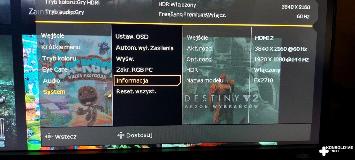 Testowany monitor zawiera również inteligentny tryb HDR. Jest on dostępny nie tylko w grach na PS5 i Xbox Series, ale nawet w filmach oraz na Switchu. EX2710 posiada wbudowany emulator HDR, dzięki któremu skorzystamy z alternatywnych trybów odwzorowania kolorów nawet tam, gdzie jest on niedostępny.