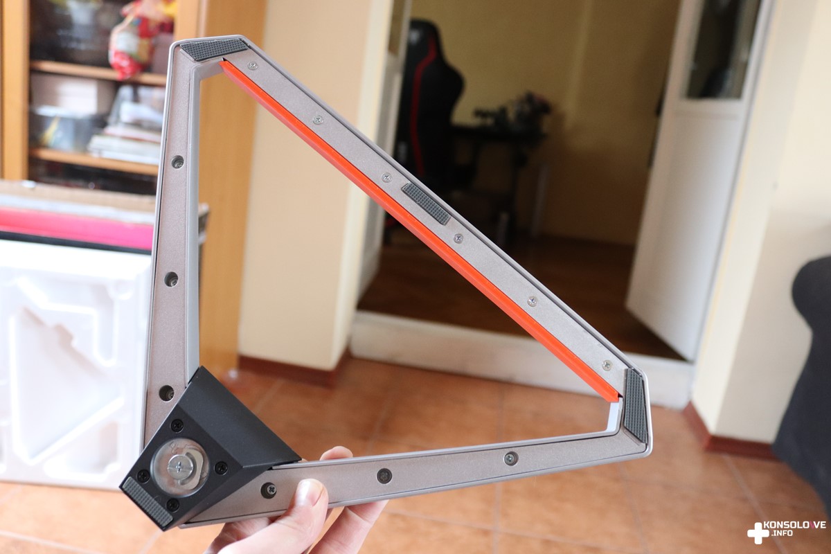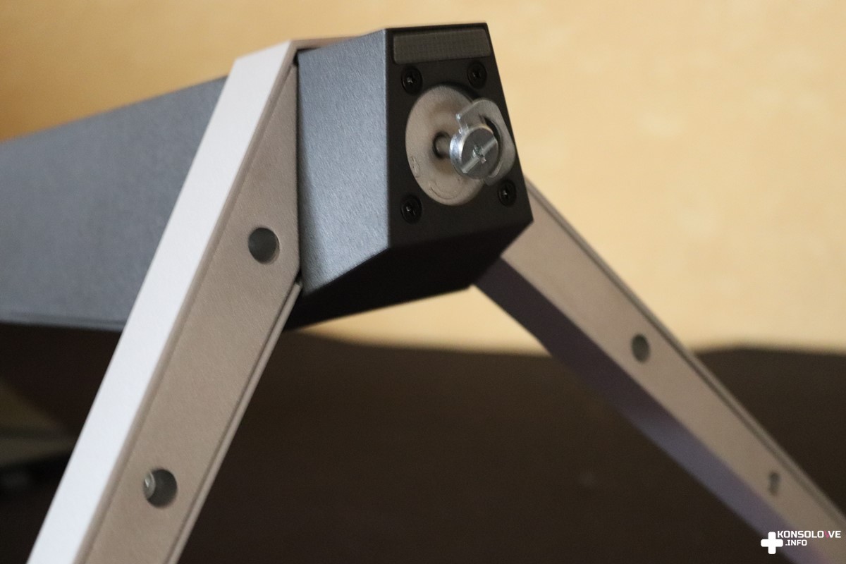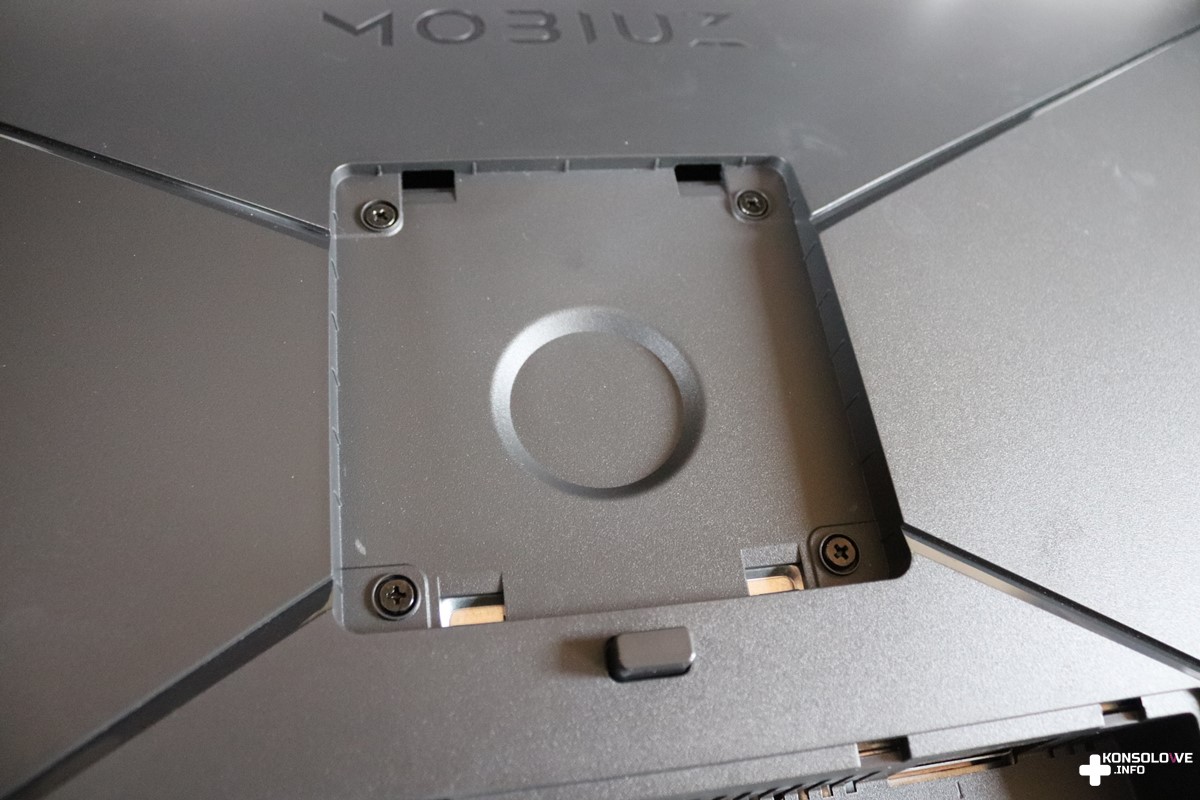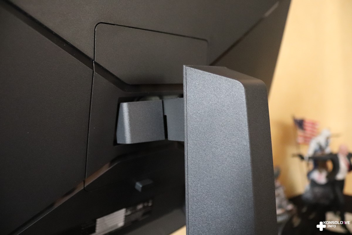 Proces montażu rozpoczynamy od wsunięcia ramienia do trójkątnej podstawy. Następnie przykręcamy je specjalną śrubą umocowaną w podstawie. W kolejnym kroku wciskamy monitor w zatrzaski ramy i właściwie mamy już złożony cały zestaw. Składanie monitora jest niesamowicie szybkie i przyjemne – na pewno nie sprawi to nikomu trudności. Jeśli będziecie chcieli zdemontować wszystkie elementy, to nic prostszego. W przypadku ramy i podstawy wystarczy po prostu poluzować śrubę. Natomiast na tylnej części monitora znajdziemy przycisk zwalniający zatrzaski. Jest on umieszczony bardzo sensownie i na pewno nie zahaczycie o niego przypadkiem, szukając podświetlanego joysticka podczas standardowego użytkowania monitora.