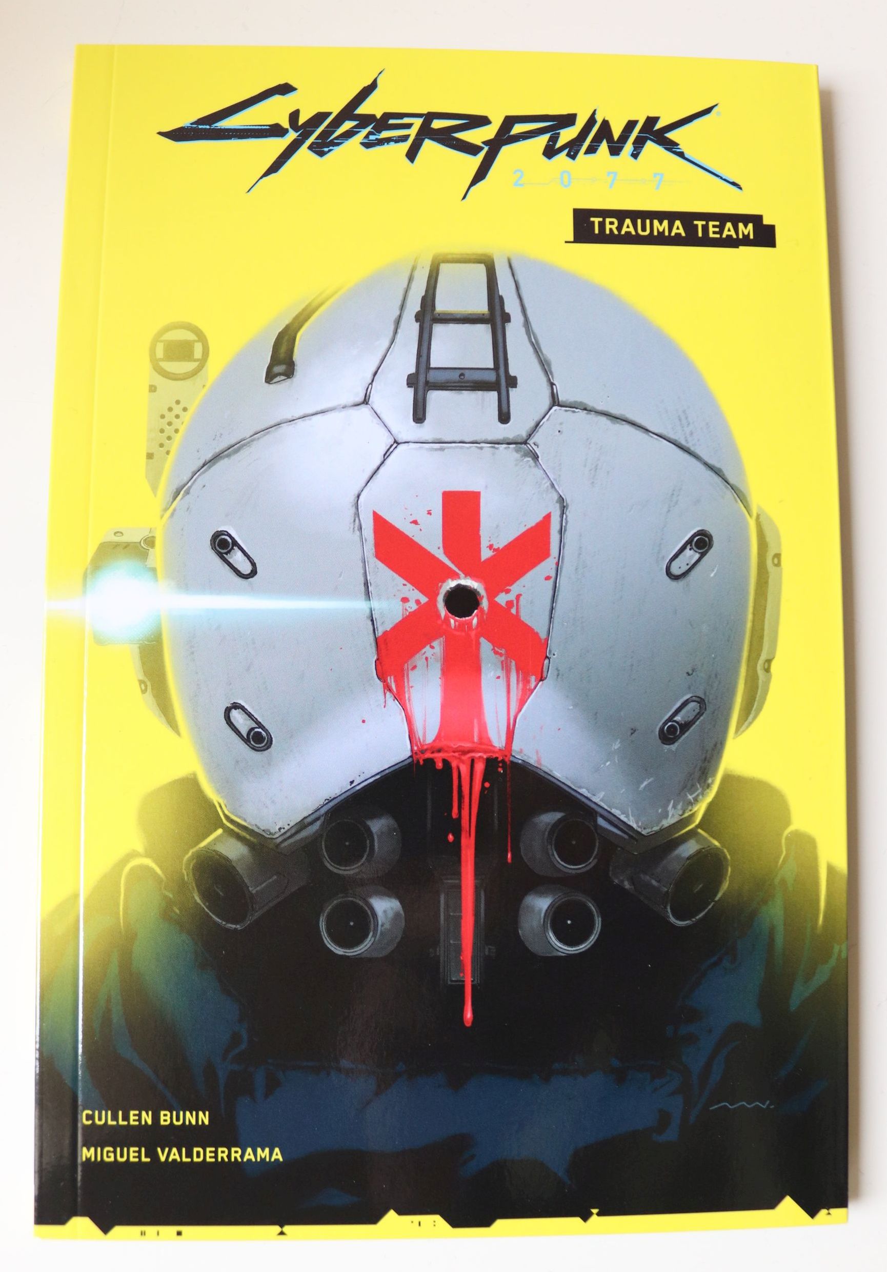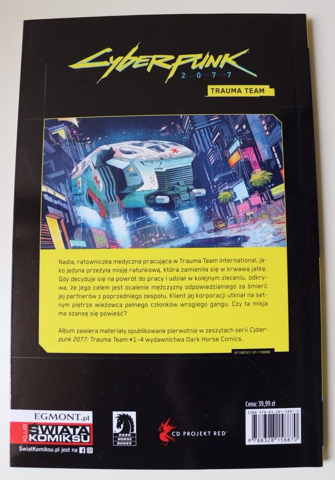 Cyberpunk 2077 – Trauma Team to bardzo dobra ilustrowana opowieść. Wydarzenia wciągają, a występujące postaci są wiarygodne. Nie brakuje też ujęć pierwszoosobowych podczas mierzenia z broni, co tylko pogłębia poczucie bycia realną częścią historii. Szkoda jednak, że album jest jedynie w miękkiej oprawie (ze skrzydełkami). Wolałbym twardą, aczkolwiek trudno byłoby taką dostać dla tak niedługiej opowieści. Trauma Team liczy 96 stron i kosztuje 39,99 zł. Jednakże na stronie wydawnictwa Egmont można dostać ten komiks w promocji za 27,99 zł. To bardzo dobra cena i interesująca propozycja. Nie tylko dla fanów gry studia CD Projekt RED, ale ogólnie dla miłośników dobrych cyberpunkowych opowieści. Szczerze polecam.