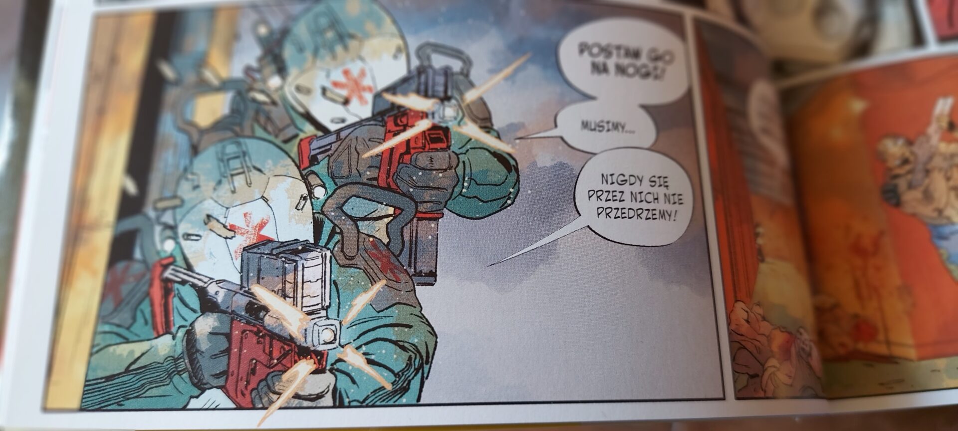 Trauma Team może się pochwalić bardzo dobrym papierem. Przewracanie stron jest wygodne, a gramatura pozwala komfortowo kartkować komiks, nie obawiając się o ewentualne podarcie kartek. Wykorzystana farba drukarska jest wysokiej jakości i przesuwanie palcem nie pozostawia żadnych śladów ani na zeszycie, ani na nas. Całości pozytywnego wizualnego wrażenia dopełniają ilustracje autorstwa Miguela Vanderramy. Kolory są bardzo dobrze dobrane i faktycznie można odnieść wrażenie zanurzania się w Night City. Czujemy klimat Pacifiki i oddech Animalsów na karku, niemal słyszymy świst kul i wybuchy granatów. Trauma Team to jeden z najładniejszych komiksów, jakie miałem przyjemność czytać i prawdziwa gratka dla fanów Cyberpunka. Przeczytanie tego albumu nie zajmuje długo – ja potrzebowałem zaledwie pół godziny na dotarcie do ostatniej strony. W żadnym razie nie jest to czas stracony. Historia, której scenariusz napisał Cullen Bunn, autentycznie wciąga i jesteśmy ciekawi co będzie dalej. Wszystkie wątki logicznie spinają się w spójną całość i losy Nadii śledzi się z ogromną przyjemnością. Bynajmniej nie oznacza to, że jej historia jest lekka. Serwowana w Trauma Team opowieść jest dojrzała i bez wątpienia napisano ją z myślą o pełnoletnim odbiorcy. Podobnie jak w przypadku gry Cyberpunk 2077, tak i komiks jest bogaty w wulgaryzmy, seks i erotykę. Nie jest to oczywiście wada – taki świat został wykreowany już w Cyberpunku 2020 i takie są reguły Night City.