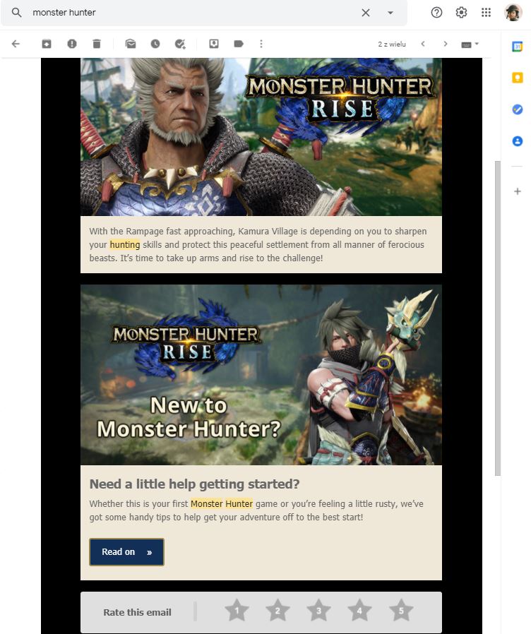 Trzeba bez dwóch zdań pochwalić twórców o materiały dostarczane poza samą grą. Na przykład maile z podstawami, czy prowadzenie świetnej wiki dostępnej również w języku polskim! Gra jest bardzo obszerna, stąd wynika pewne zdezorientowanie na początku. Mimo wszystko chciałbym, żeby takie problemy mieć w innych, często prostych jak drut grach. W Monster Hunter Rise polowania przeważnie były przyjemnymi wyzwaniami, szczególnie jeżeli wyjdziemy ze strefy komfortu i wypróbujemy nową broń. Podsumowując, odkrywanie tej gry kojarzy mi się z dużą satysfakcją i jest bardzo przyjemne.