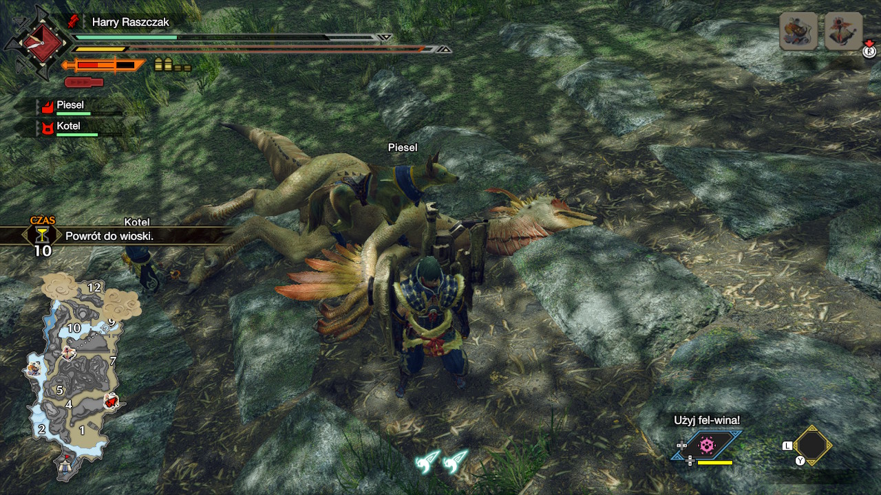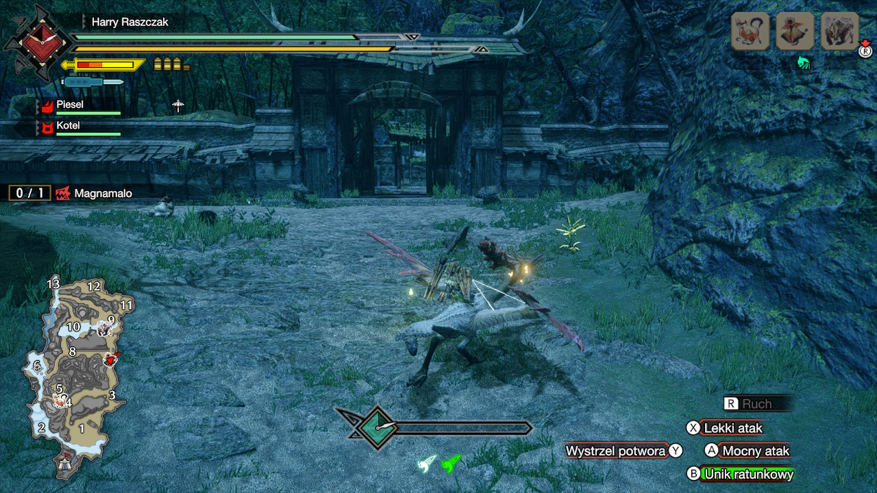Trzeba wspomnieć o poziomie trudności, szczególnie dla kogoś kto nie miał wcześniej styczności z serią. Początkowe zlecenia są wprowadzeniem do gry, kiedy pojawia się jakiś nowy element rozgrywki spotykamy się również z wyskakującym oknem, który opisuje nam daną funkcjonalność. Niektóre elementy są jednak potraktowane mniej dokładnie niż inne. W moim wypadku potrzebne było dokształcenie się z elementów ekwipunku na YouTube. W Monster Hunter Rise mamy bowiem aż 3 nachodzące na siebie systemy skrótów w których dowolnie ustawimy wyposażenie, czynności, czy komunikację z innymi graczami.