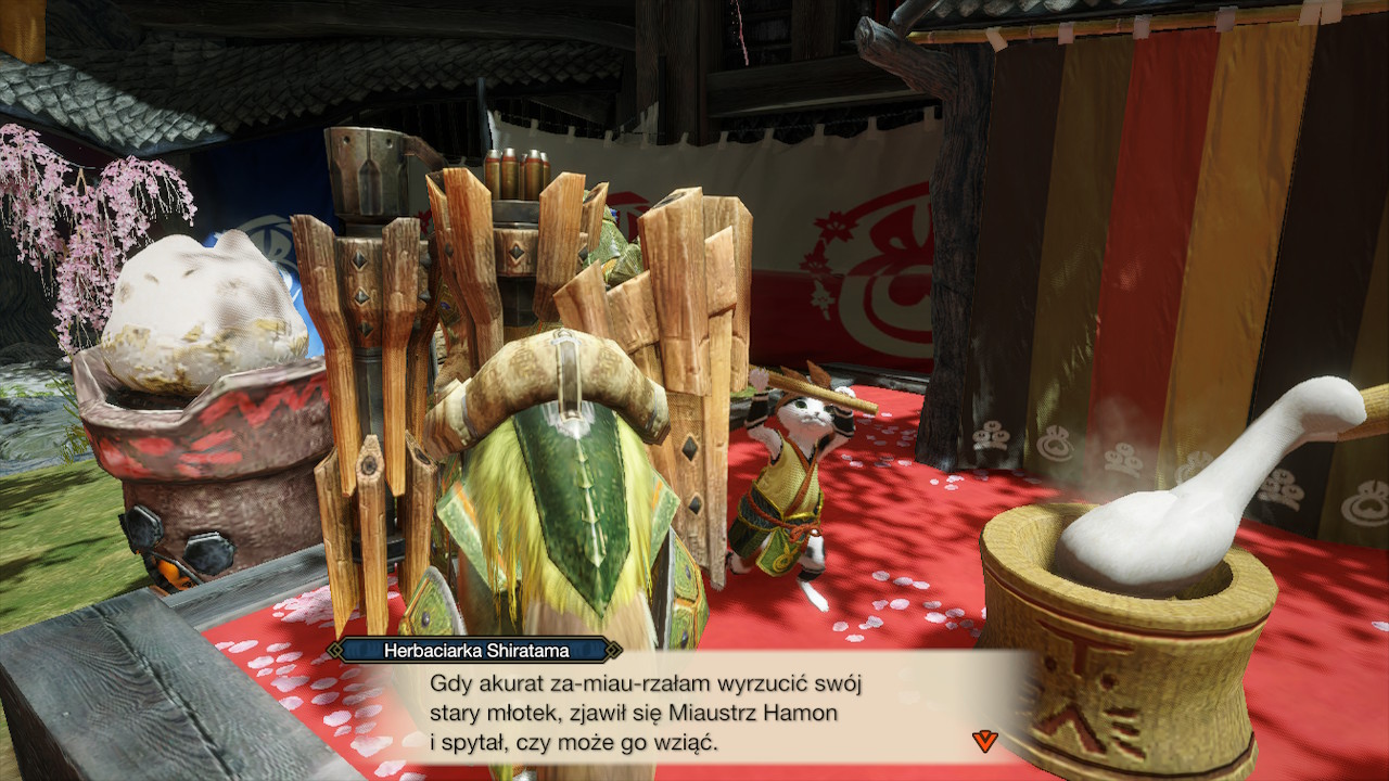 Dobrze, przenieśmy się jednak do wioski Kamura, bazy dla naszych łowieckich wypadów. Już w menu tytułowym możemy zobaczyć jej przebitki, ale nic nie może równać się z samodzielnym jej przemierzaniem. Poruszanie się po ścieżkach, obserwowanie koleżkotów wyrabiających dango, mieszkańców z którymi możemy zamówić słowo… a nawet sam widok budynków, chatek, powiewających na wietrze chorągwi – robi kapitalne wrażenie. Cieszy na pewno to, że graficy nie uciekli w jakiś przerysowany, artystyczny styl. Postarali się wiernie odtworzyć elementy otoczenia i postaci – odważne założenie, szczególnie jeżeli chodzi o przenośną konsolę Nintendo. Pierwsze pół godziny gry spędziłem po prostu na chodzeniu i oglądaniu wioski i jej mieszkańców.