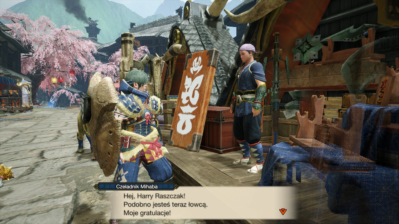 Wspomnę o łyżeczce dziegciu, którą przyjdzie nam posmakować na początku przygody z Monster Hunter Rise. Po krótkim wprowadzeniu, miałem wrażenie, że nasz główny bohater jest niemową – zabieg często spotykany w grach. Okazuje się, jednak że zdarza się bohaterowi powiedzieć pojedyncze słowa. Niestety podobnie sprawy mają się z resztą mieszkańców wioski (oczywiście poza przerywnikami filmowymi). Rozmów nie ma w grze jakoś strasznie dużo, szkoda więc, że linie dialogowe nie zostały w pełni nagrane. Mruknięcia i pojedyncze słowa po angielsku trochę mnie irytowały, więc po krótkiej chwili zmieniłem ustawienie audio na język japoński. Świetnie się to komponowało z klimatem gry. Został on w moim odczuciu zaburzony przez jeszcze tylko jeden dźwięk. Podczas misji treningowych, gdy na mapie zaznaczony jest punkt zbiórki, wydaje on współczesny dźwięk przypominający przychodzący sms. Nie wiem czemu nie zdecydowano się na bardziej pasujący do gry dzwoneczek czy gong.