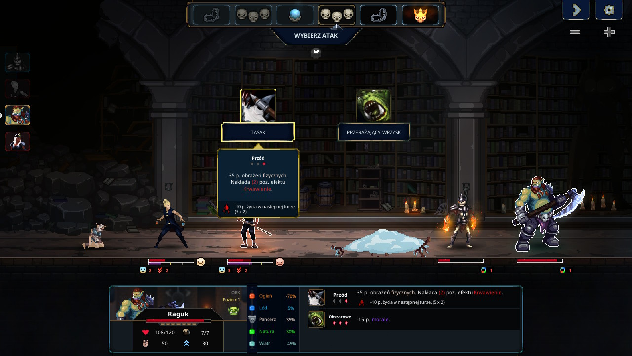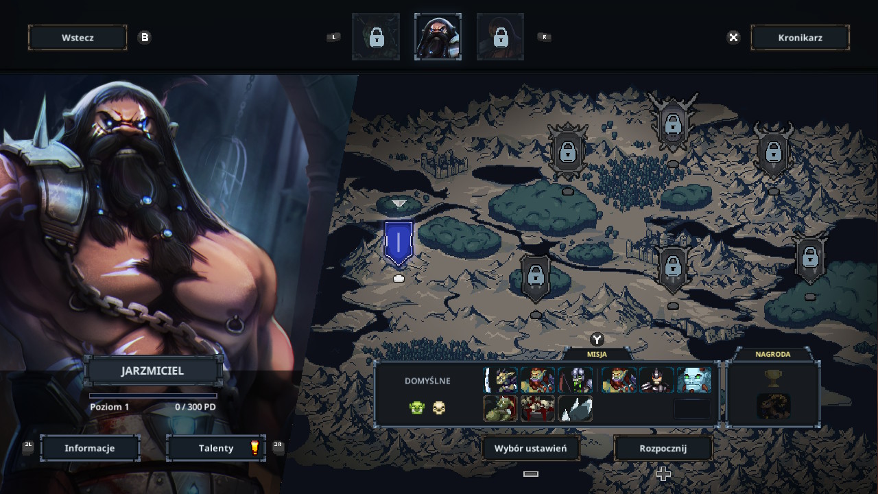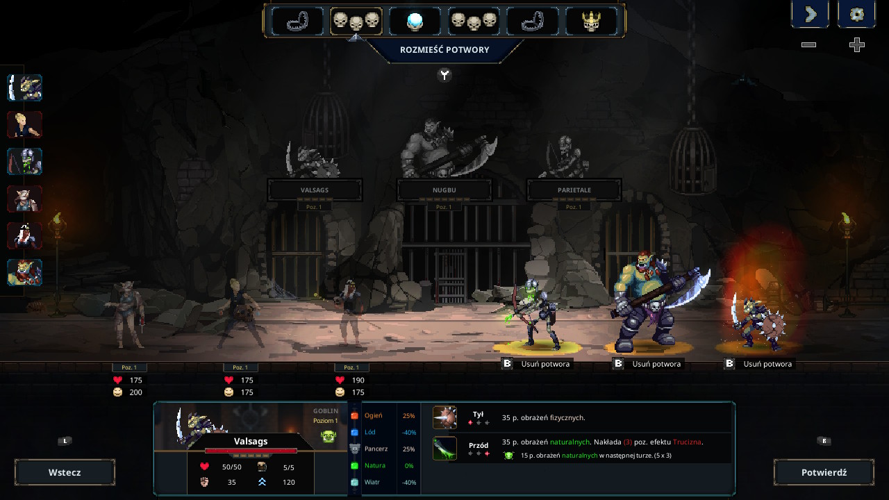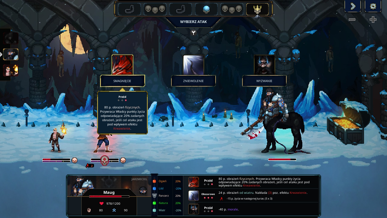 Fajny bonus pojawia się po wygranej bitwie – otrzymujemy zupełnie nową postać / pułapkę do wyboru lub wybieramy zwiększenie umiejętności Jarzmiciela. Do wyboru, do koloru! Z kolei awans oznacza dodatkową komnatę z mocną postacią, która walczy w naszej drużynie.