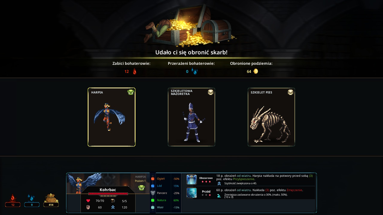 Nasz Jarzmiciel jest bardzo obowiązkowy i swoje zadania wykonuje według kalendarza. Jedna misja na jeden tydzień. Z każdą misją zbiera doświadczenie, nowe postacie, nowe pułapki, złoto, krople krwi oraz łez. Są to zasoby, które wykorzystamy do zwiększania umiejętności postaci i pułapek, oraz do zakupu zupełnie nowych. Żeby było ciekawiej, można też wymienić jedną walutę na inną, co może okazać się bardzo pomocne. Niestety, nasze maleńkie potworki się męczą, więc od czasu do czasu musimy je usunąć z misji, by odpoczęły i nabrały sił. Przyznaję, że w jednej z misji źle to rozegrałam, przez co przegrałam. Podobnie jak w Hadesie, dopiero po przegranej nasza główna postać odbiera swoje PD.