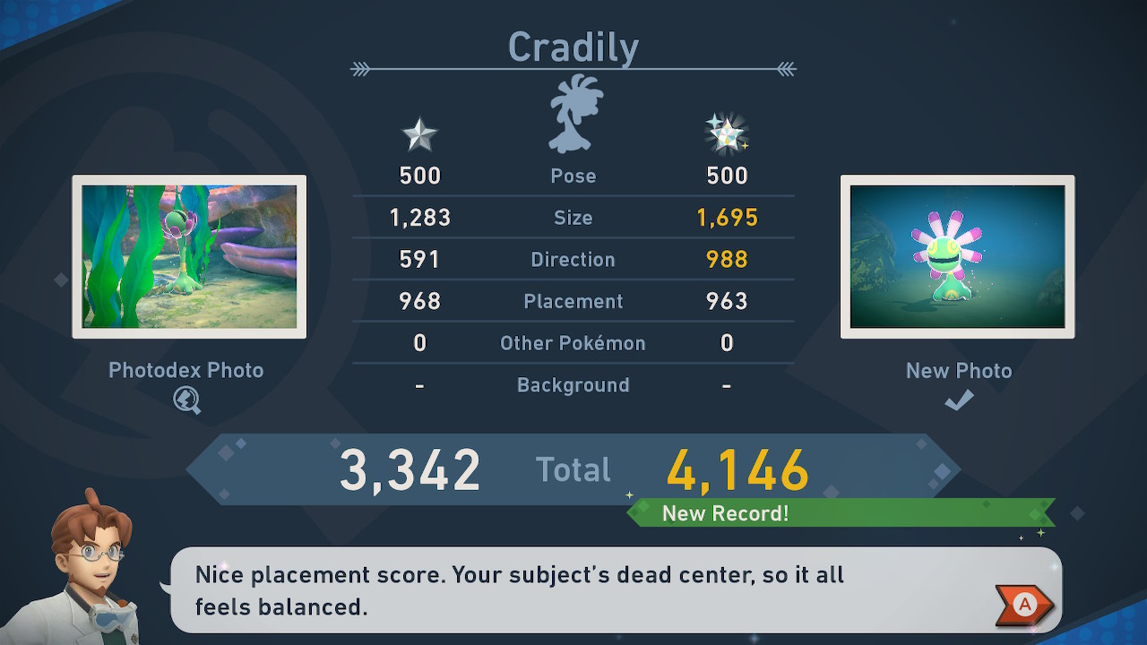 Następnie wybrane zdjęcia oceniane są przez profesora Mirrora w podstawowych kategoriach. Liczy się poza Pokemona, jego rozmiar, obrót względem obiektywu, kompozycja, inne Pokemony, oraz tło. Algorytm oceni każdą z pozycji – najgorsze zdjęcia będą brązowe, najlepsze zaś – diamentowe. Skoro mamy już opisane podstawy, przejdźmy do warstwy graficznej.