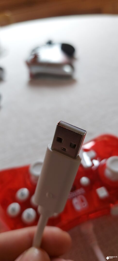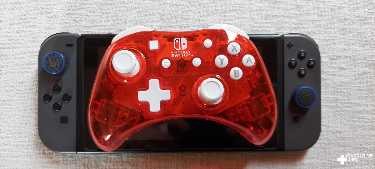 Wspomniany kabel musimy podłączyć do portu USB. Możemy wykorzystać do tego celu jedno z trzech gniazd tego typu na stacji dokującej. Ja preferowałem podłączenie kontrolera PDP do gniazda na boku stacji, aczkolwiek można podpiąć kabel również między przewody HDMI, a zasilający. Kabel jest dość długi i nie miałem problemu, aby usiąść wygodnie na kanapie i korzystać z podpiętego do telewizora Switcha. Testowany kontroler jest przezroczysty. Możliwość zajrzenia do środka urządzenia bez jego rozbierania jest bardzo miłym akcentem i z pewnością spodoba się wielu osobom. Dokładne oględziny pada wykazały niestety bardzo poważny z mojego punktu widzenia minus. Nie znajdziemy w nim bowiem portu słuchawkowego. Jesteśmy więc zmuszeni do korzystania z głośników telewizora bądź zaopatrzenia się w słuchawki bezprzewodowe, które sparujemy z telewizorem. Z recenzenckiego poczucia obowiązku sprawdziłem oczywiście podłączenie pada do stacji i korzystanie ze Switcha w trybie przenośnym. Nie jest to możliwe. Nie uważam jednocześnie, aby rozwiązanie takie było optymalne, a więc nie jest to w moich oczach wada pada.