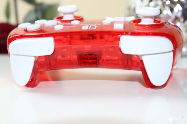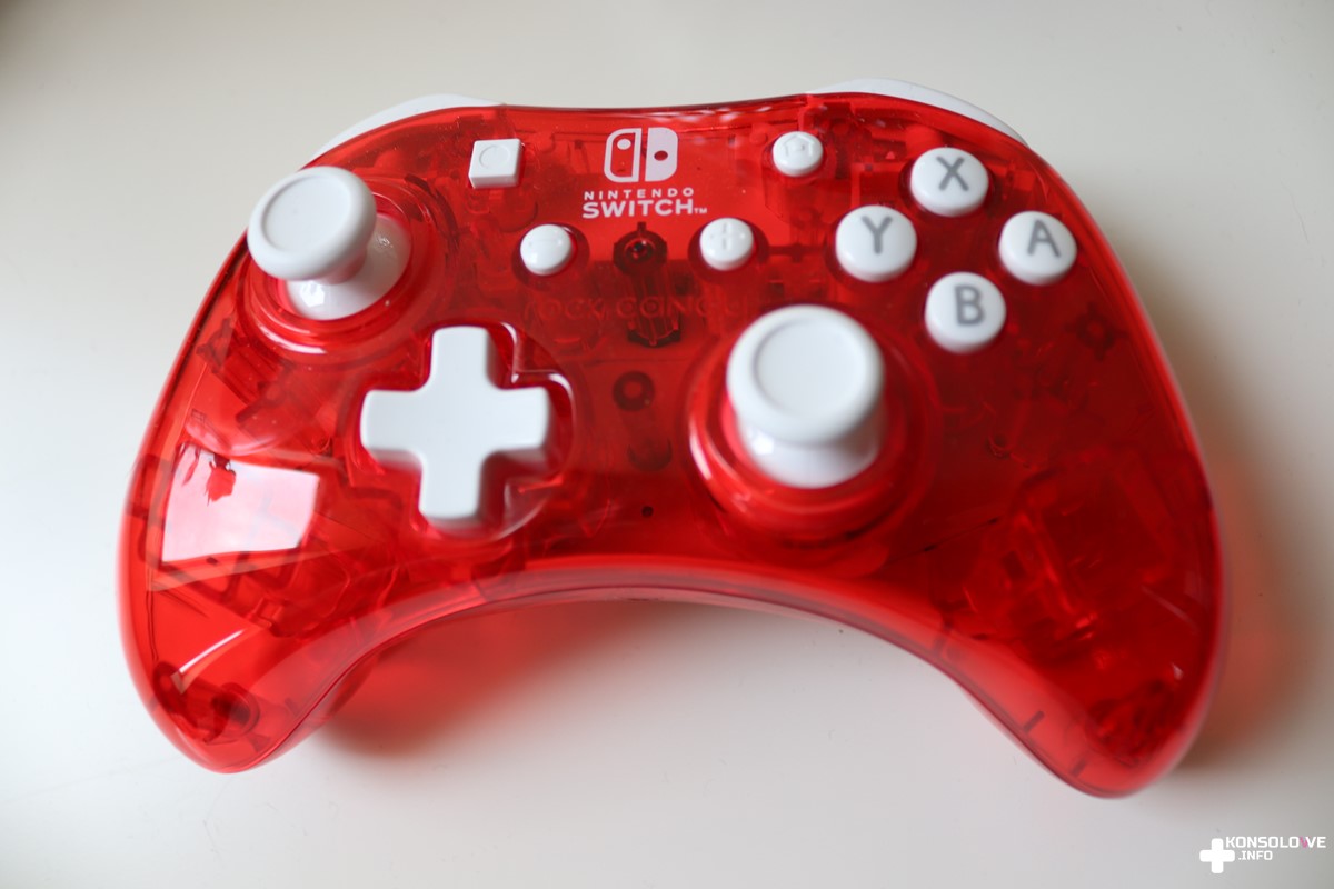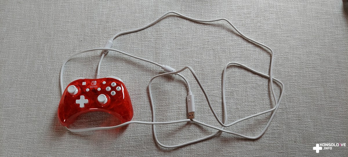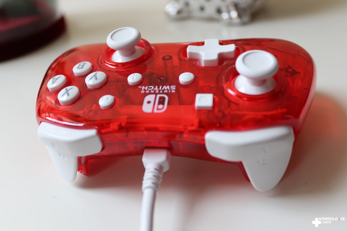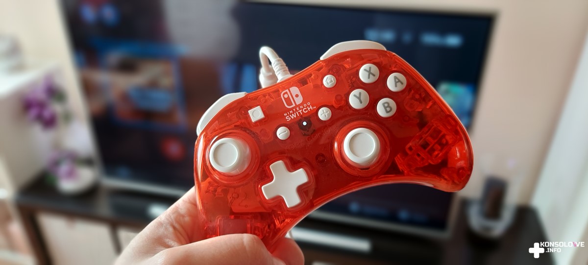 Testowany kontroler należy do serii Rock Candy. Mi przypadło oceniać pada w czerwonym kolorze, a więc w barwie, z którą od lat kojarzy się Nintendo. Wygląd kontrolera od PDP jest bardzo przyzwoity i nie ukrywam, że spotkał się z moim uznaniem. Oprócz przeważającej czerwieni znajdziemy też białe akcenty. Ten kolor przypisany jest do obu gałek analogowych oraz wszystkich przycisków, spustów i bumperów. Tworzy to bardzo zgrabne połączenie, a całości skojarzenia z Nintendo dopełnia zamieszczenie logotypu wielkiego N na froncie kontrolera. Pad posiada również biały kabel o długości wynoszącej 2,5 metra. Co istotne, przewód można odczepić. Niewątpliwie dzięki temu przechowywanie urządzenia i zabieranie go ze sobą na wspólne sesje ze znajomymi będzie bardzo wygodne. Trzeba się jednocześnie przyzwyczaić do zmienionego umiejscowienia przycisków. Zrzuty ekranu i ekran główny konsoli znajdują się na górze, natomiast na dole znajdziemy + i -. Jest więc odwrotnie niż w standardowych kontrolerach dedykowanych Switchowi.