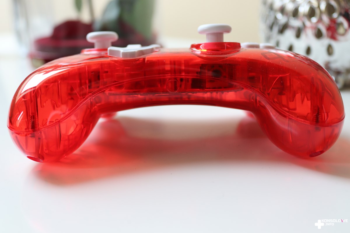 Wspomniany kabel musimy podłączyć do portu USB. Możemy wykorzystać do tego celu jedno z trzech gniazd tego typu na stacji dokującej. Ja preferowałem podłączenie kontrolera PDP do gniazda na boku stacji, aczkolwiek można podpiąć kabel również między przewody HDMI, a zasilający. Kabel jest dość długi i nie miałem problemu, aby usiąść wygodnie na kanapie i korzystać z podpiętego do telewizora Switcha. Testowany kontroler jest przezroczysty. Możliwość zajrzenia do środka urządzenia bez jego rozbierania jest bardzo miłym akcentem i z pewnością spodoba się wielu osobom. Dokładne oględziny pada wykazały niestety bardzo poważny z mojego punktu widzenia minus. Nie znajdziemy w nim bowiem portu słuchawkowego. Jesteśmy więc zmuszeni do korzystania z głośników telewizora bądź zaopatrzenia się w słuchawki bezprzewodowe, które sparujemy z telewizorem. Z recenzenckiego poczucia obowiązku sprawdziłem oczywiście podłączenie pada do stacji i korzystanie ze Switcha w trybie przenośnym. Nie jest to możliwe. Nie uważam jednocześnie, aby rozwiązanie takie było optymalne, a więc nie jest to w moich oczach wada pada.