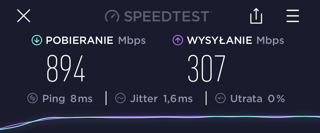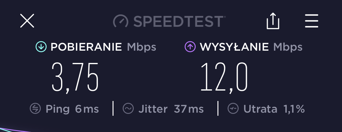 Z czystej ciekawości wyszedłem z telefonem z mieszkania i zszedłem do parteru. Przy wejściu do bloku wyniki nie powalały, ale to nic dziwnego biorąc pod uwagę ile betonu było po drodze. Test też wykonałem na MacBooku Pro.
