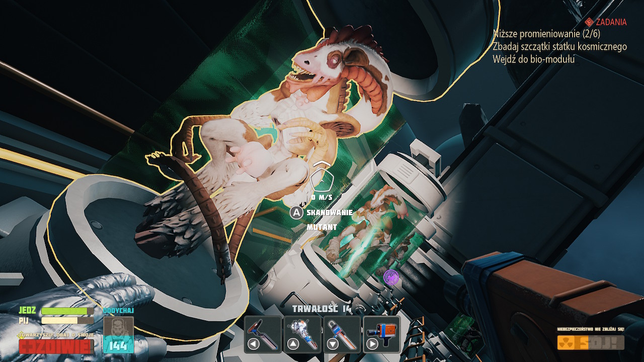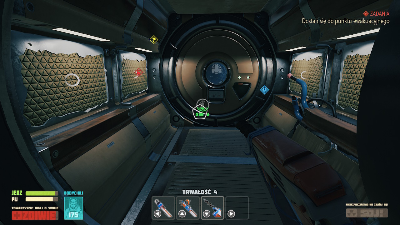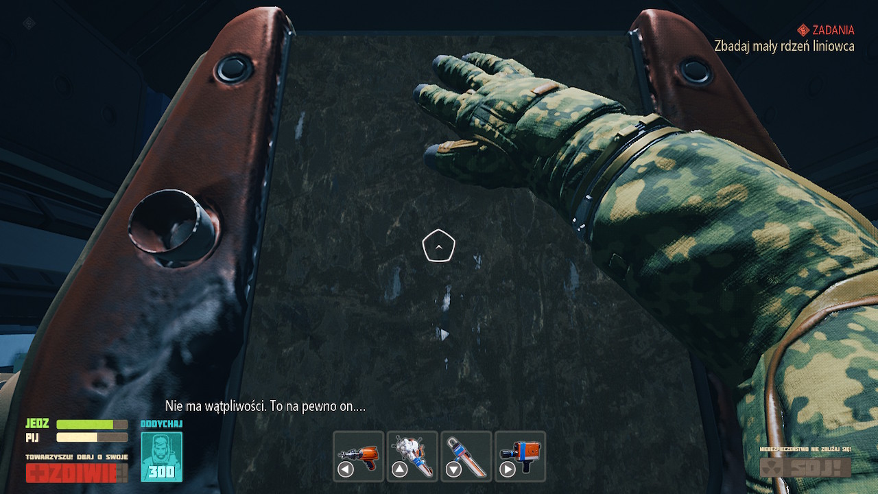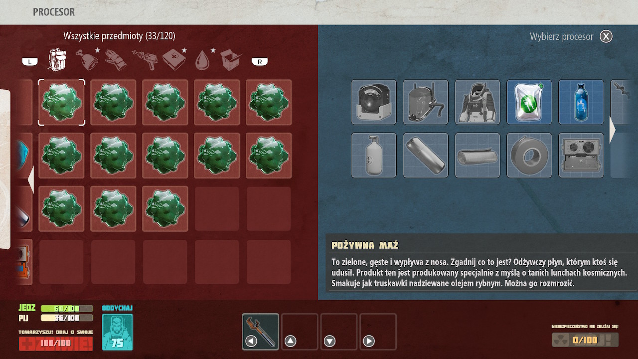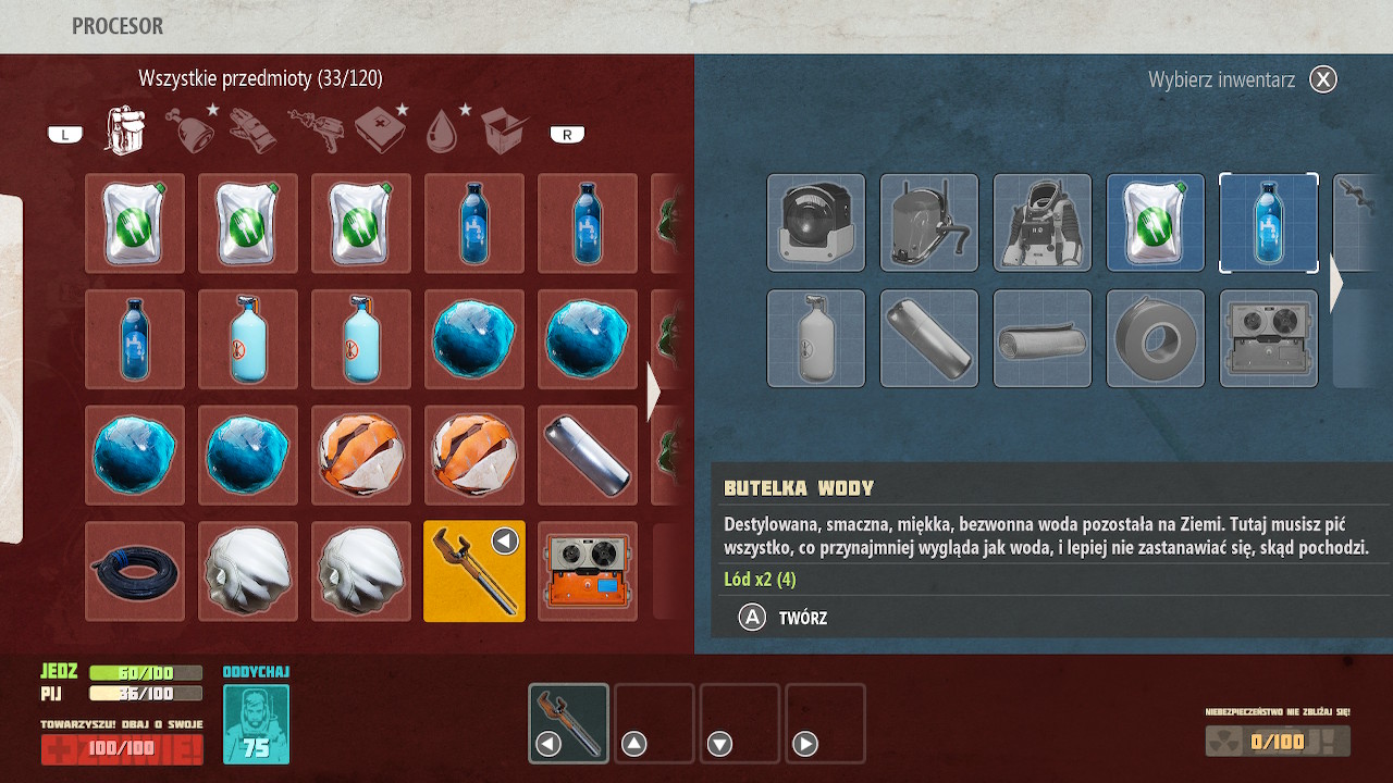 Wybrano rozwiązanie, gdzie każdy przedmiot, nie ważne czy duży jak skafander, czy mały jak butelka wody, zajmuje jedno miejsce w ekwipunku. Zasobność szafek, skafandra ma po prostu określoną liczbę przedmiotów, które przechowają. Skutkuje to dosyć częstą potrzebą długiego przewijania takich samych zasobów. Trochę szkoda, że nie postanowiono połączyć takich samych przedmiotów w jednym kafelku, oraz pokazać obok ich ilość. Do tego, do końca rozgrywki miałem problemy z odruchowym naciskaniem B aby opuścić widok ekwipunku… co skutkowało wyrzuceniem przedmiotu. Ekwipunek otwieramy i opuszczamy przy użyciu +.