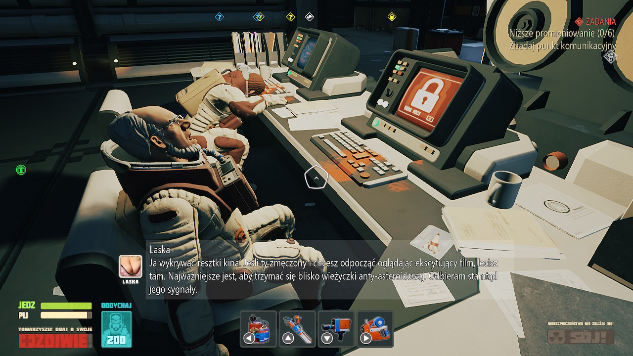 Wszystko to okraszone jest pokaźną i solidną ścieżką dźwiękową nawiązującą do XX wiecznych utworów raczej ze wschodu Europy, niż nowoczesnych brzmień. Wpasowuje się to w ogólną estetykę prowizorki i propagandowego patosu. Jak już wspominałem, świat ukazany w Breathedge zdecydowanie odbiega od “przepychu” znanego z Prometeusza. Pomyślcie raczej o Nostromo, którego wyprodukowano jeszcze po złej stronie żelaznej kurtyny.