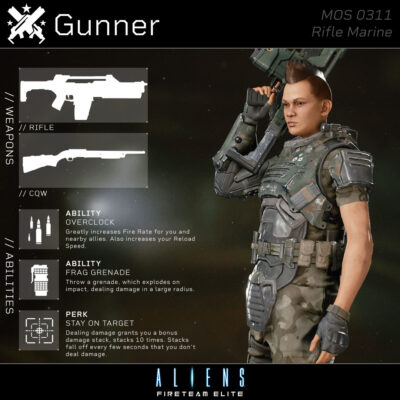 Strzelec będzie dobrym wyborem na bliski i średni dystans. W jego arsenale znajdą się granaty, które będziemy mogli modyfikować wraz z rozwojem postaci. Jako dodatkową umiejętność, zwiększa szybkostrzelność znajdujących się blisko kompanów i samemu szybciej przeładowuje broń. Wiemy już, że umiejętnością pasywną ma być naliczanie dodatkowych, coraz większych obrażeń, jeżeli będziemy kontynuować celny ostrzał.