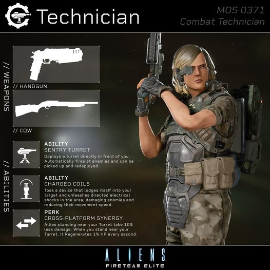Jeżeli chcieliście poczuć się jak Hudson, powinniście przemyśleć karierę technika. Przypomnę co wiemy o nim do tej pory. Głównym zadaniem technika będzie rozstawienie wieżyczek, aby zapewnić dodatkowe wsparcie ogniowe drużynie. Do swojej dyspozycji ma również specjalne miny, które porażą przeciwników prądem tym samym ich spowalniając. Wraz z rozwojem postaci będziemy mogli wybrać więcej rodzajów wieżyczek: od tradycyjnych szybkostrzelnych, poprzez te większego kalibru czy miotające ogień. Umiejętnością pasywną będzie zwiększanie wytrzymałości kompanów stojących przy wieżyczkach technika. Jeżeli staniemy przy swojej wieżyczce, co sekundę zregenerujemy punkty życia.