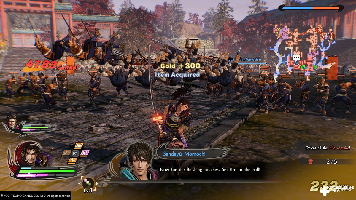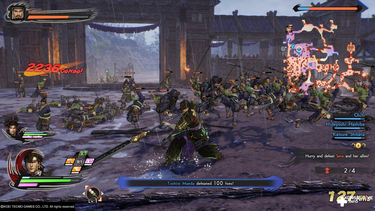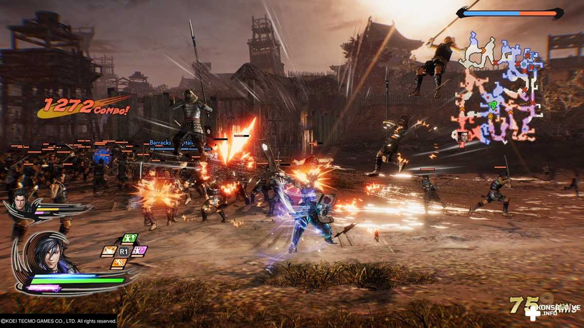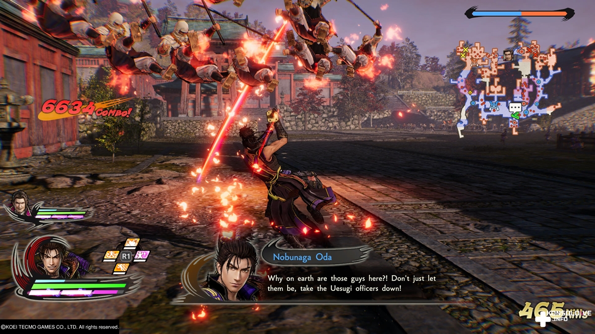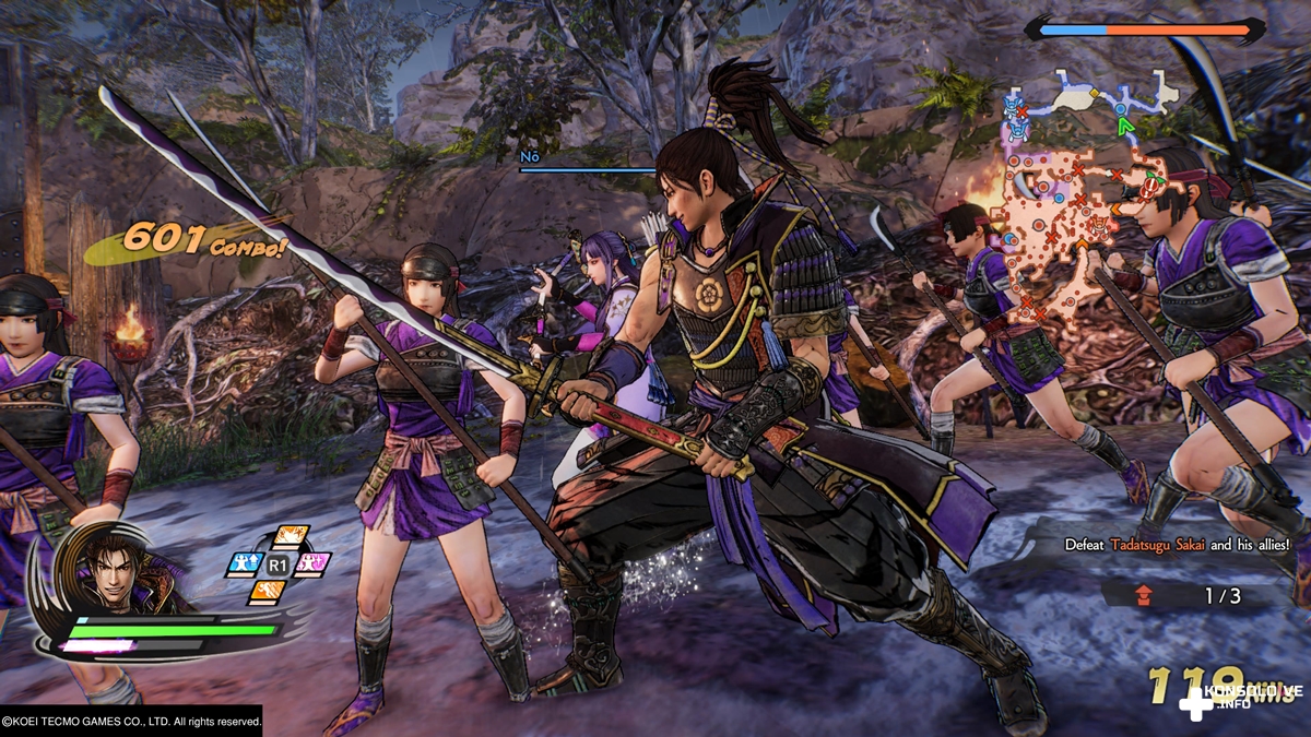 Główną siłą Samurai Warriors 5 jest w moim przekonaniu właśnie rozgrywka. Bynajmniej nie jest ona realistyczna, aczkolwiek nie można tego postrzegać za wadę produkcji. Trzeba od samego początku wiedzieć, na co należy się nastawić. Na początku tej recenzji wspomniałem, że w serii Samurai Warriors normą są starcia z wieloma przeciwnikami. Wskaźnik kombinacji (generowany oczywiście przez trafione uderzenia) błyskawicznie idzie w setki, a nawet tysiące. Na polach bitwy znajdziemy tysiące oponentów, których możemy pokonać, zwiększając tym samym ostateczną ocenę na koniec poziomu. Jednak to nie walka z szeregowymi żołnierzami przeciwnej armii jest celem każdej misji. Bitwy, które stoczymy mają różnorodne warunki odniesienia porażki bądź zwycięstwa. Możemy więc przegrać jeśli zginie któraś z naszych postaci, a wygrać na przykład pokonując po prostu jednego konkretnego przeciwnika. Brzmi to może nieco taktycznie, ale prawda jest zgoła inna – musimy przeć przed siebie, atakując wszystko, co się rusza i jest oznaczone innym kolorem niż nasza armia. Nierzadko na ekranie zobaczymy nawet kilkuset oponentów. Nigdy jednak płynność rozgrywki nie spada poniżej 60 klatek na sekundę. To ogromna zaleta recenzowanej gry. Muszę jednocześnie zaznaczyć, że nie wiem, czy tak samo jest na PS4. Ogrywałem wersję dedykowaną tej właśnie konsoli, ale dzięki wstecznej kompatybilności na PlayStation 5.