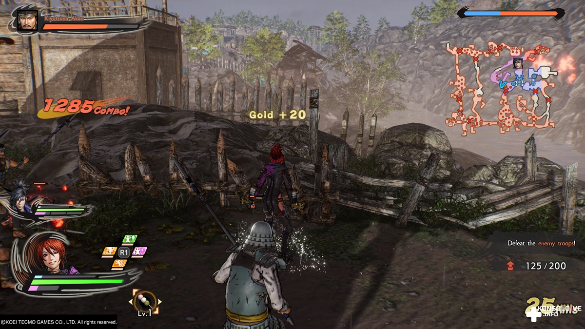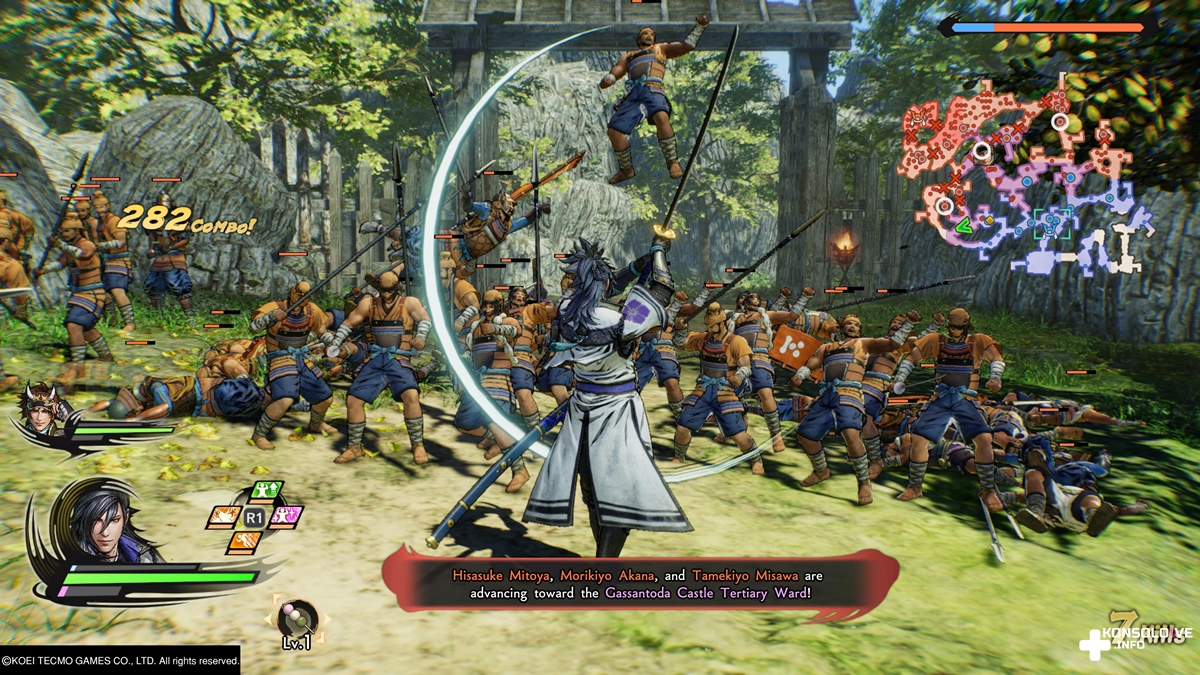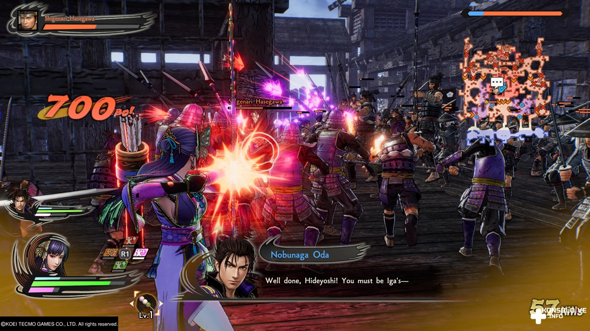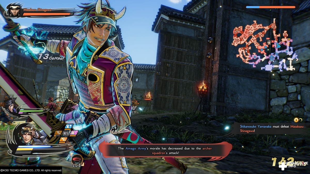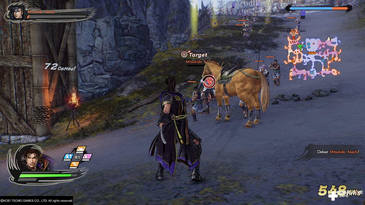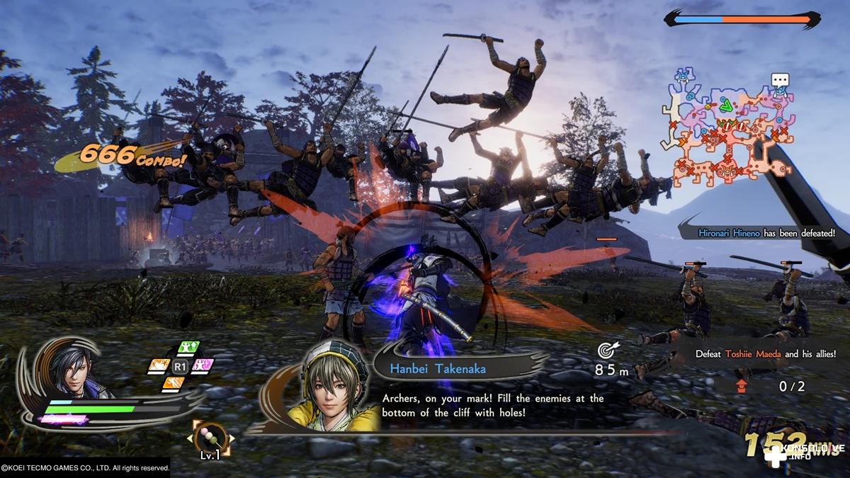 Główną siłą Samurai Warriors 5 jest w moim przekonaniu właśnie rozgrywka. Bynajmniej nie jest ona realistyczna, aczkolwiek nie można tego postrzegać za wadę produkcji. Trzeba od samego początku wiedzieć, na co należy się nastawić. Na początku tej recenzji wspomniałem, że w serii Samurai Warriors normą są starcia z wieloma przeciwnikami. Wskaźnik kombinacji (generowany oczywiście przez trafione uderzenia) błyskawicznie idzie w setki, a nawet tysiące. Na polach bitwy znajdziemy tysiące oponentów, których możemy pokonać, zwiększając tym samym ostateczną ocenę na koniec poziomu. Jednak to nie walka z szeregowymi żołnierzami przeciwnej armii jest celem każdej misji. Bitwy, które stoczymy mają różnorodne warunki odniesienia porażki bądź zwycięstwa. Możemy więc przegrać jeśli zginie któraś z naszych postaci, a wygrać na przykład pokonując po prostu jednego konkretnego przeciwnika. Brzmi to może nieco taktycznie, ale prawda jest zgoła inna – musimy przeć przed siebie, atakując wszystko, co się rusza i jest oznaczone innym kolorem niż nasza armia. Nierzadko na ekranie zobaczymy nawet kilkuset oponentów. Nigdy jednak płynność rozgrywki nie spada poniżej 60 klatek na sekundę. To ogromna zaleta recenzowanej gry. Muszę jednocześnie zaznaczyć, że nie wiem, czy tak samo jest na PS4. Ogrywałem wersję dedykowaną tej właśnie konsoli, ale dzięki wstecznej kompatybilności na PlayStation 5.