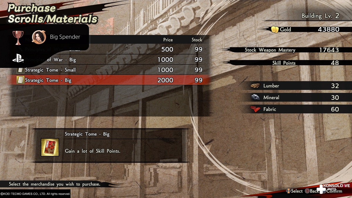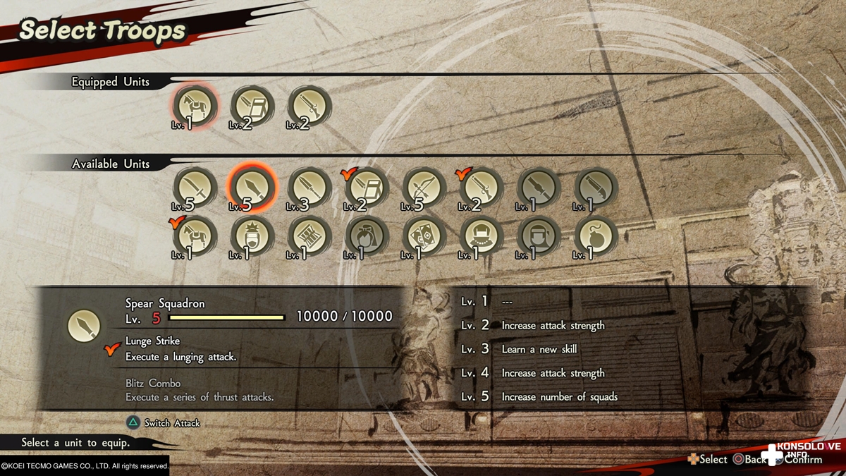 Rozwój nie ogranicza się do postaci. Omega Force postanowiło pozwolić graczom na ulepszanie również budowli, broni oraz wierzchowców. Kupując coraz to wyższe poziomy Dojo, odblokujemy możliwość coraz dalszego awansowania naszych postaci. Zdecydowanie warto się tym zainteresować – na im wyższym są poziomie, tym więcej ruchów automatycznie jest dodawane do ich wachlarzów. Wyższe poziomy są też oczywiście wymagane, aby móc odblokować wszystkie umiejętności w menu rozwoju bohatera. Przyznaję, że z ogromną przyjemnością wydawałem zarobione punkty doświadczenie, aby poprawić skuteczność moich wojaków. No i nic tak nie cieszy jak widok całkowicie wypełnionego drzewka umiejętności. Wspomniałem też o rozwijaniu broni i warto poświęcić mu nieco miejsca w niniejszej recenzji. Nasz oręż, a dokładniej poziom jego opanowania, możemy zwiększać, wydając zgromadzone na misjach punkty. Wiąże się z tym ranga broni – od najsłabszej, F, aż do najlepszej – S. Im wyższa ranga, tym skuteczniejsza jest broń i tym większe obrażenia zadaje. Warto jeszcze zaznaczyć, że możemy nakładać na nią elementy zwiększające szansę na wywołanie określonego efektu. Zamrażanie, palenie, więcej punktów doświadczenia – możliwości jest multum.
