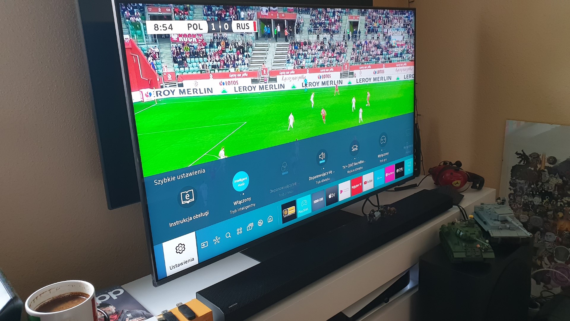 Warto wspomnieć, że w testowanym modelu HW-Q800A zastosowano funkcję Dźwięk Dopasowany do Przestrzeni. Ta automatycznie, dzięki inteligentnym czujnikom, dostosowuje poziom i jakość dźwięku, dbając o regulację poziomu pogłosu dźwięku przestrzennego trybun z kibicami oraz słyszalność dialogów komentatorów. Dzięki temu możemy mieć pewność, że otrzymujemy idealne brzmienie w naszym pomieszczeniu. Oglądając niejeden mecz, mogłem odnieść wrażenie, że czysty i głęboki dźwięk napływał do mnie z każdej strony.