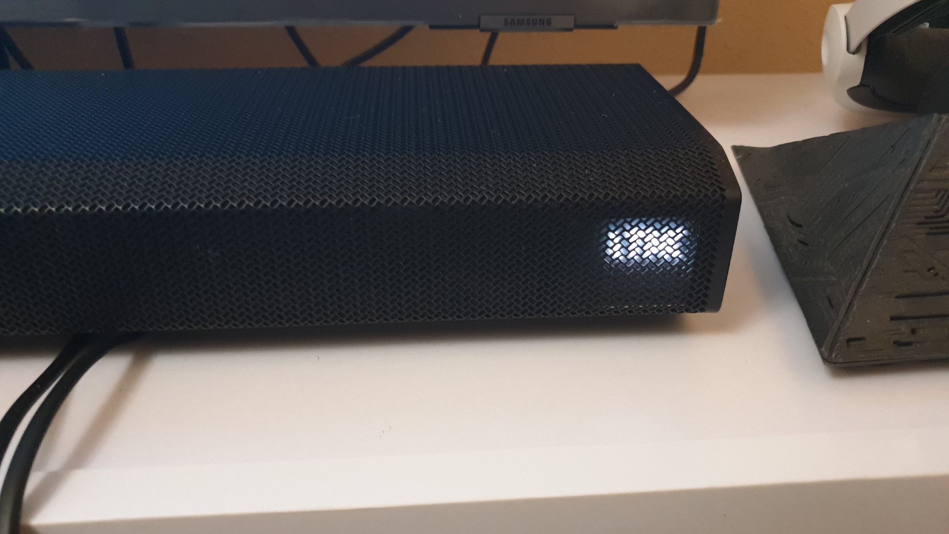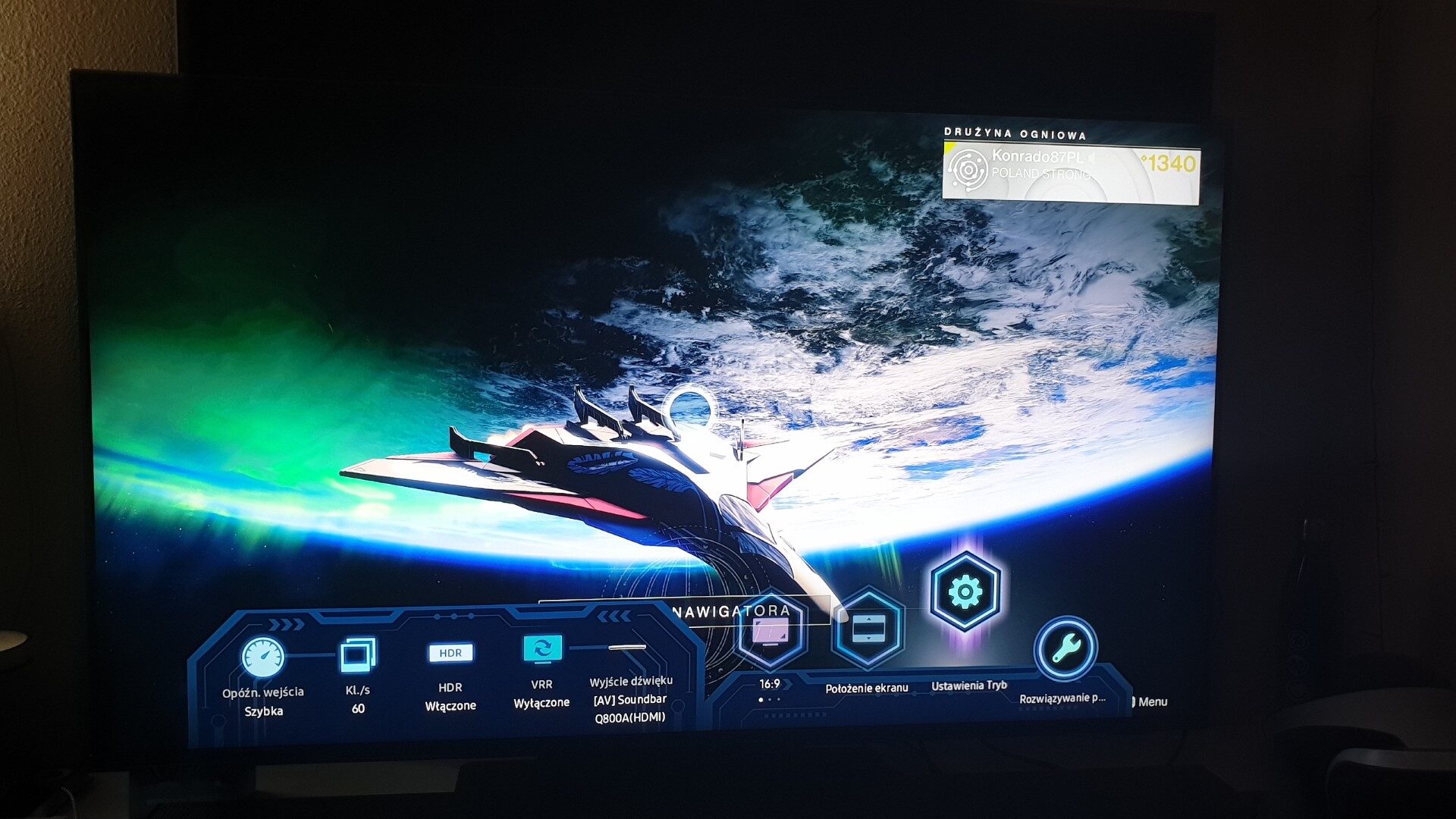 - Informacja o źródle dźwięku. Tutaj nie ma co się za bardzo rozpisywać – po prostu dostaniemy informację, z jakiego źródła dźwięku korzystamy. Mogą to być głośniki telewizora, soundbar, czy słuchawki bezprzewodowe. Warto tu także wspomnieć, że firma Samsung cały czas rozwija Inteligentny Dźwięk dla Graczy. Jest to możliwe dzięki swojej unikatowej technologii Dźwięk Podążający za Obiektem.