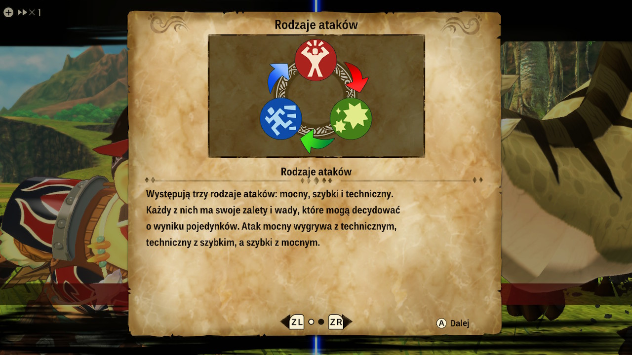 Wracając do zasad, to silne uderzenie wygrywa z technicznym, ale przegrywa z szybkim. Atak techniczny pokona zaś szybki. Wygranie pojedynku zablokuje natarcie przeciwnika, bądź znacząco go obniży. Do tego dochodzą ataki specjalne, wzmocnienia… Przy czym cały czas mamy wrażenie walki w klasycznym Monster Hunter, obserwując i odgadując zamierzenia potwora z którym walczymy.