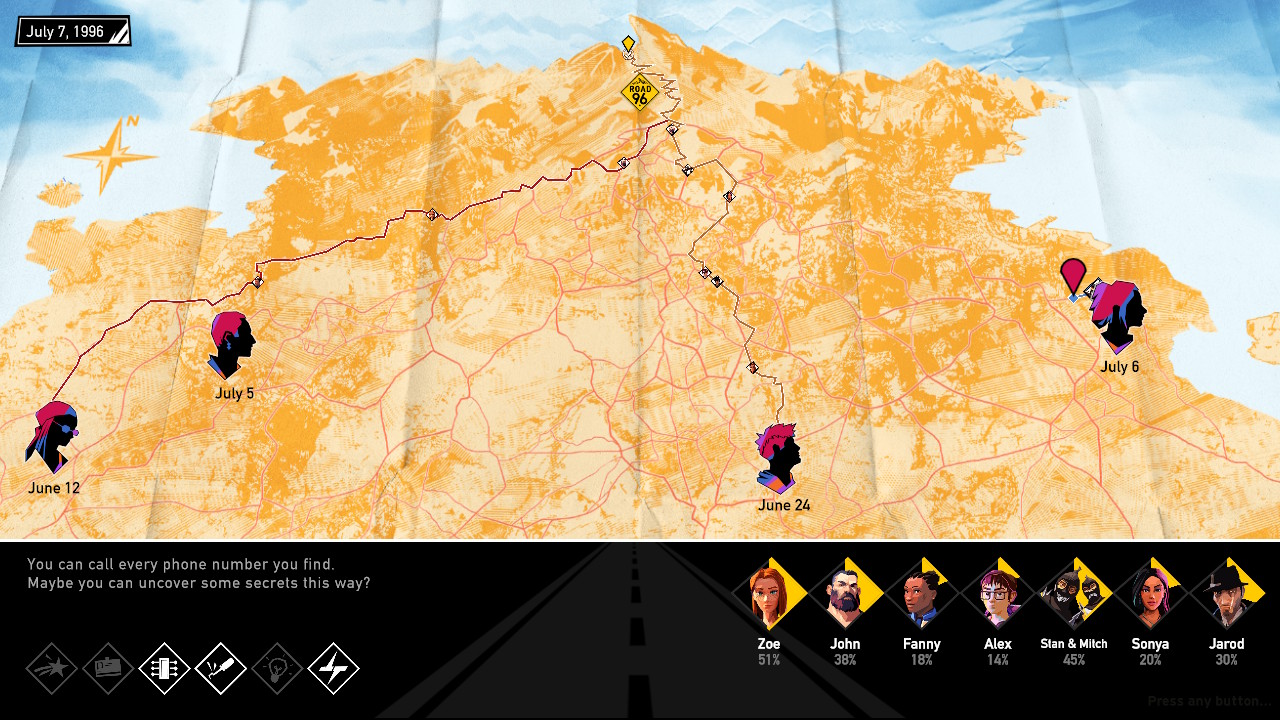 Road 96 to tytuł, który zaprasza w szaloną podróż, podczas której odkrywamy wyjątkowe miejsca i ciekawe postacie. To nasze wybory mają ogromny wpływ na to, co wydarzy się dalej podczas drogi do granicy. W naszych rękach i konsolach) leży los młodych ludzi, szukających wolności. Gra jest pełna hitów z lat dziewięćdziesiątych, a grafika przepełniona pastelowymi odcieniami, które na długo pozostają w pamięci.