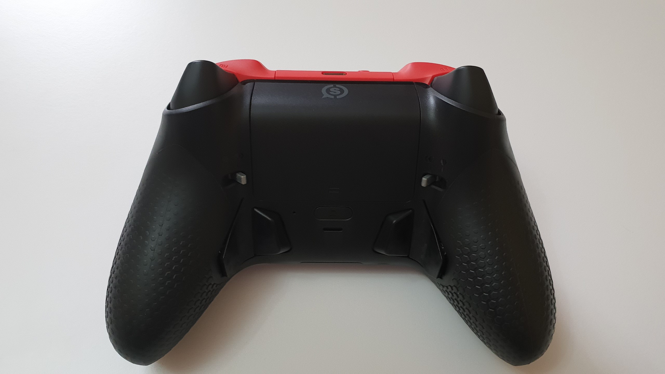 Pod spodem kontrolera umieszczono cztery dodatkowe przyciski. Dwa duże znajdują się na gripach, a dwa mniejsze tuż pod klapką na baterie. Tak, ten kontroler jest na baterie – dwa paluszki AA, ale o tym za chwile. Trzymając kontroler w rękach, praktycznie cały czas trzymamy palce serdeczne na dwóch dużych dodatkowych przyciskach. Podobnie jak w przypadku zablokowanych spustów, również dodatkowe przyciski mają ustawiony niski skok – jak w myszce. Reakcja po ich naciśnięciu jest więc natychmiastowa. Mniejsze przyciski natomiast mają budowę trójkąta prostokątnego. Dzięki temu, odrywając palec od dużych przycisków od razu uderzamy w te mniejsze. Przyznaje, że jest to nietypowy układ, do którego trzeba się przyzwyczaić, ale w gruncie rzeczy sprawdza się świetnie. Warto wspomnieć, że na przednim panelu, u samego jego dołu, umieszczono przycisk od włączenia i wyłączenia mikrofonu w przewodowych zestawach słuchawkowych. Te podpinamy oczywiście do gniazda audio jack 3.5 mm.
