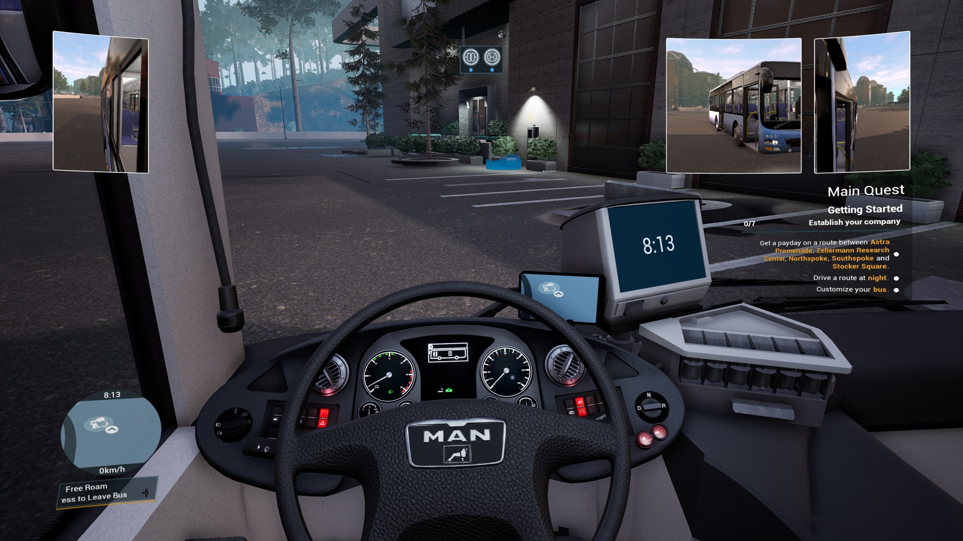 Prawie każdy przycisk w kokpicie jest klikalny. Dostaniemy się do niego przy pomocy emulowanej myszki (prawy analog). Niestety opisy na przyciskach często są nieczytelne z powodu niskiej rozdzielczości. Na szczęście mamy też dostępną drugą metodę sterowania autobusem — przez menu kołowe. Tam możemy wybrać nie tylko opcje związane z silnikiem i skrzynią biegu, ale też ustawiać wszystkie światła w autobusie czy też otwierać drzwi.