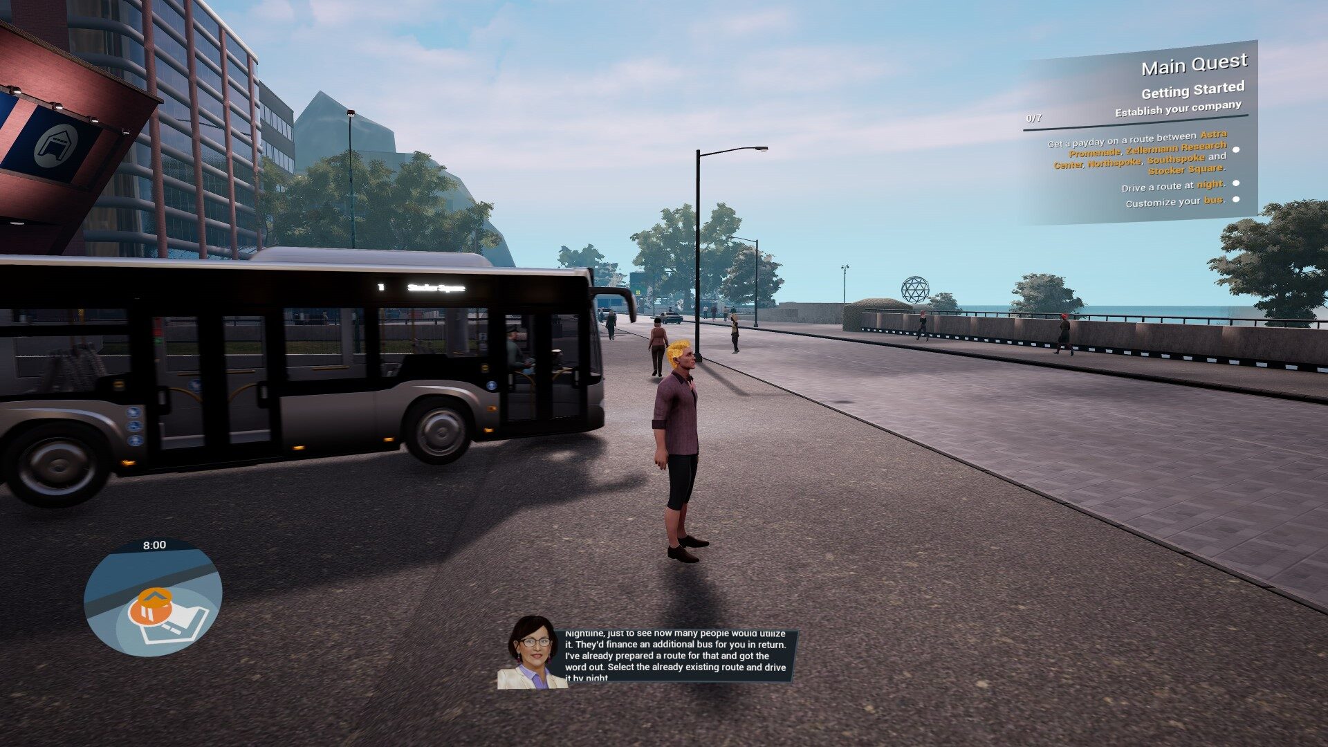 Jak widzicie, jest co robić w trakcie jazdy. Za każdy kurs dostajemy wypłatę. Pieniądze możemy wydać na nowo autobusy, a następnie utworzyć nowe linie. To nasze drugie zadanie. Rozwijanie sieci i łączenie kolejnych przystanków. Miasto, a właściwie to dwa, są duże, z bardzo unikatowymi dzielnicami.