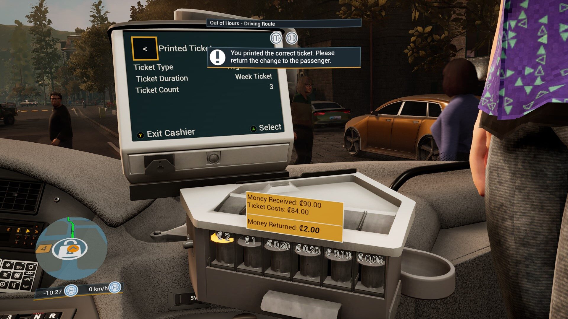 Będąc na przystanku, nie tylko wpuszczamy pasażerów, ale tez sprzedajemy bilety. Sprzedaż jest prosta. Pasażer w formie dialogu informuje nas jakie bilety potrzebuje, my je wyklikujemy na specjalnej kasie, a następnie wydajemy resztę, którą musimy policzyć w głowie i to najlepiej jak najszybciej.