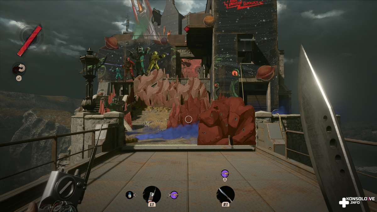 Jeśli graliście w serię Dishonored, to z pewnością pamiętacie sporą swobodę, jaką oddali nam programiści ze studia Arkane. Mogliśmy wybić całe miasto lub oszczędzić wszystkich jego mieszkańców. Nasze główne cele nie musiały być zabite – mogliśmy na przykład wysłać pewnego zarządcę do prac w kopalni, upokarzając go, ale nie pozbawiając życia. Dishonored to seria, w której walka w otwartym konflikcie była ostatecznością i korzystaliśmy głównie z ostrza. W Deathloop również mamy do dyspozycji broń sieczną – maczetę. Jest ona idealna do ataków z ukrycia. Możemy co prawda korzystać z niej również po tym, jak wykryją nas przeciwnicy, aczkolwiek nie jest to optymalny asystent w takiej sytuacji. Wtedy z pomocą przychodzi broń palna. Sięgamy po nią zdecydowanie częściej niż w Dishonored, ale i jest jej nieporównywalnie więcej. Mamy więc UZI, pistolet z tłumikiem, strzelbę, dwa potężne pistolety (które możemy złożyć w jeden, zmieniając tryb prowadzenia ognia), karabiny… Z pewnością każdy znajdzie coś dla siebie. Broń możemy dodatkowo modyfikować, co prowadzi do kolejnego akapitu.