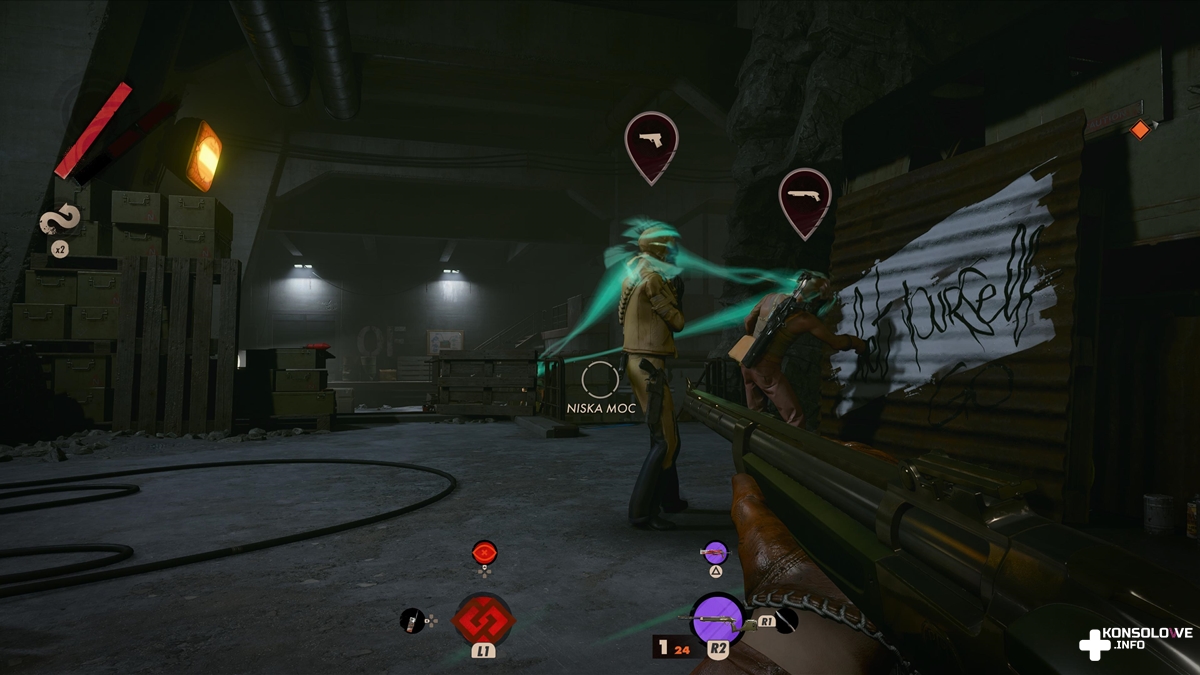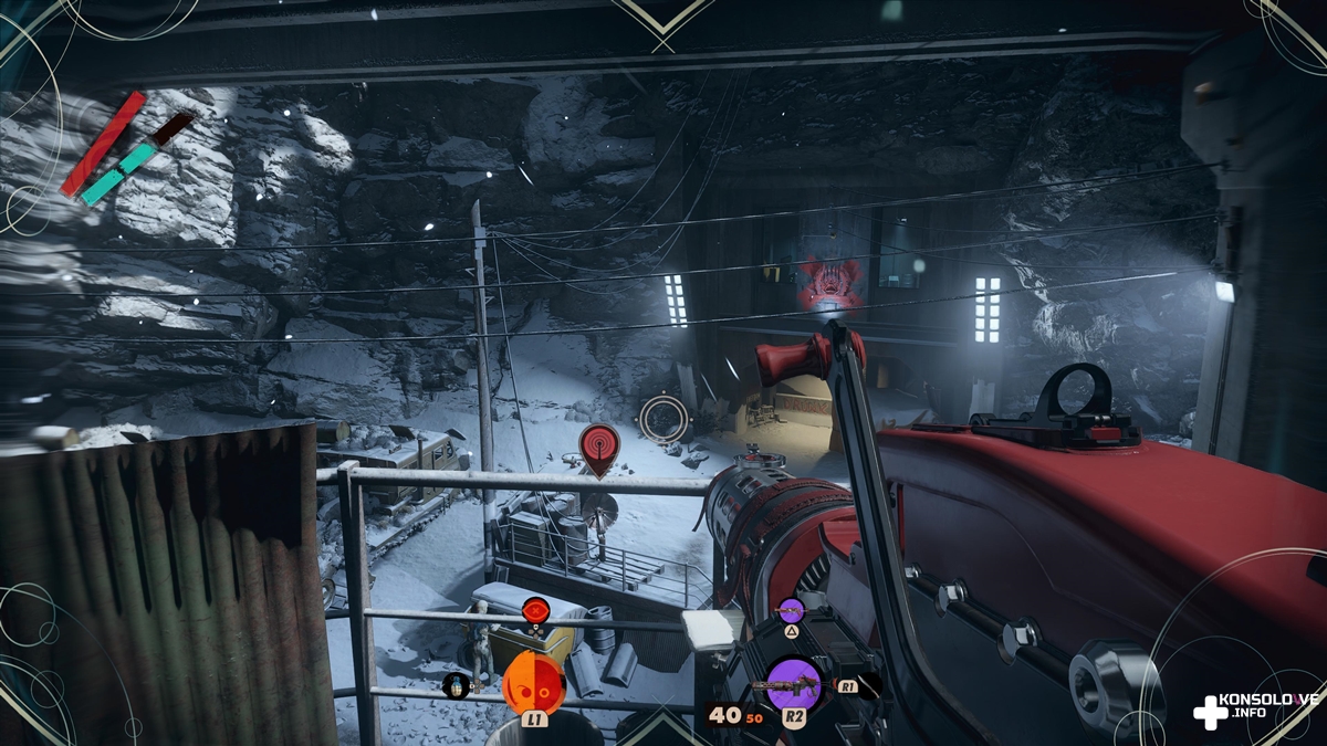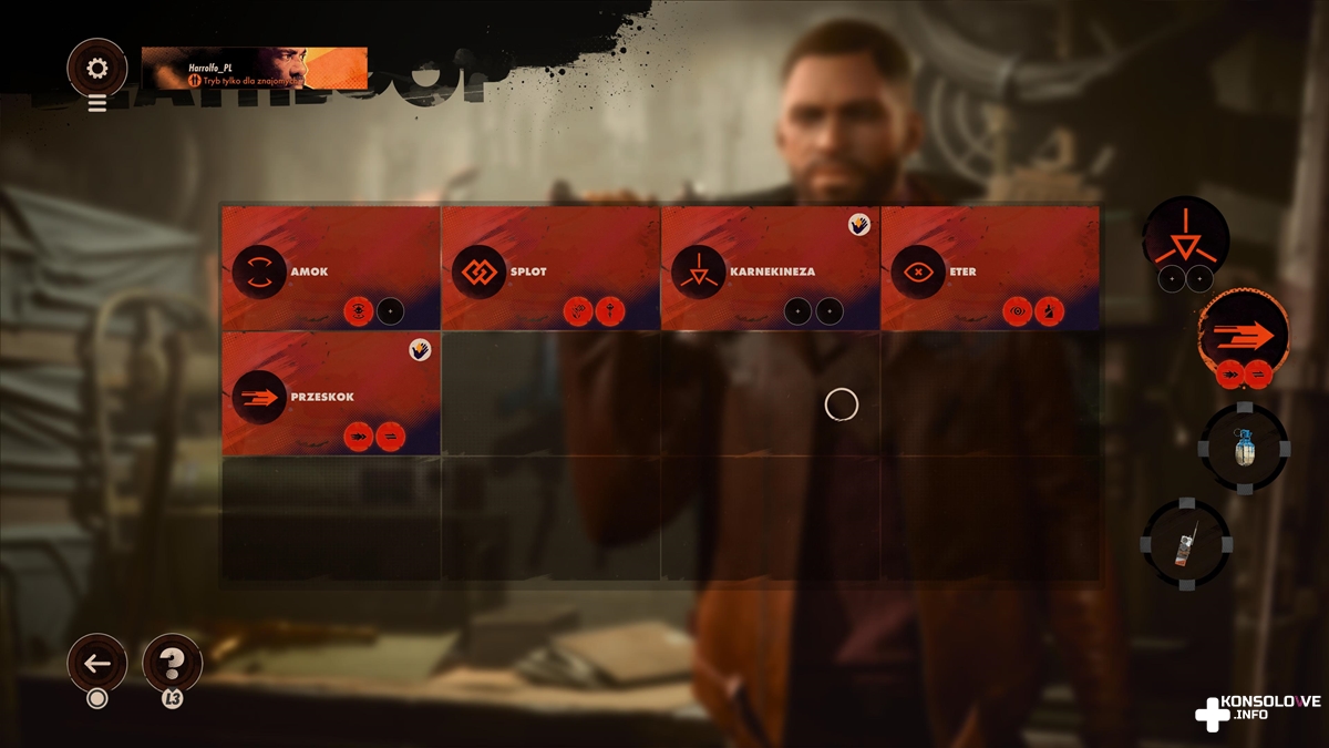 Czym byłaby gra od Arkane bez specjalnych umiejętności postaci? Wzorem przytaczanego w niniejszym wpisie wiele razy Dishonored, Deathloop również pozwala nam korzystać z nadnaturalnych zdolności. Naturalnie nie będę Wam przedstawiał wszystkich umiejętności, ale wspomnę o niektórych, moim zdaniem, najbardziej przydatnych. Jak wcześniej wspomniałem, zabijając Juliannę lub innych Wizjonerów, możemy natknąć się na tabliczkę. Jedna z nich pozwala nam przeskakiwać szybko na krótki odległości – coś na wzór Mignięcia z przygód Corvo Attano. Z pewnością nieraz będziecie korzystali z tej możliwości, chcąc przekraść się za oponentami. Dla miłośników skradania przygotowano też czasową niewidzialność. Natomiast zwolennicy naczyń połączonych z pewnością upodobają sobie Splot. Ta umiejętność łączy ze sobą wycelowanych nią przeciwników. Następnie to, co się stanie jednemu z nich przenosi się na pozostałych powiązanych oponentów. To bardzo przydatna umiejętność i zdziwiłbym się, gdyby nie stała się jedną z Waszych ulubionych. Splot otwiera oczywiście nowe możliwości przekradania się i cichego likwidowania kilku przeciwników naraz.
