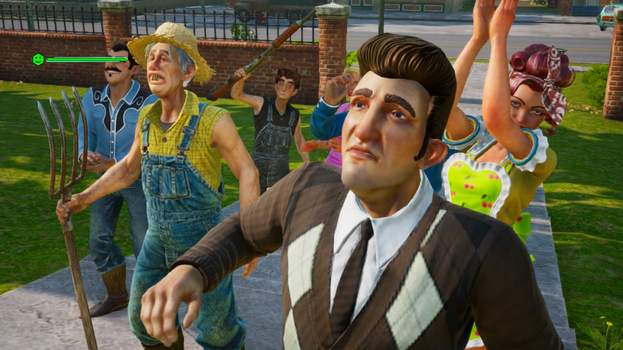 Na uwagę zasługuje tło historii. Ameryka lat 50-tych, z całą nagonką na komunistów, filmową i muzyczną popkulturą na czele. Wszystko to podane jest w mocno dowcipnym, groteskowym sosie, choć nie wydaje się kiczowate. Niszcząc radiowozy, czołgi, czy w końcu całe budynki nie raz gościł na moich ustach szeroki uśmiech. Nie tylko spowodowany satysfakcjonującą rozgrywką, ale też śmiesznymi komentarzami czy przerywnikami filmowymi.