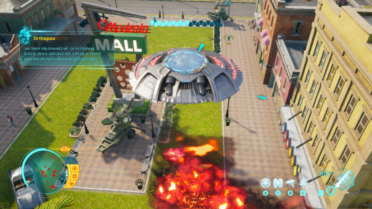 Sama rozgrywka umiejętnie przechodzi między misjami gdzie liczy się zrobienie dużej rozwałki, a tymi… gdzie musimy się podszyć pod ludzi i skradać. Tak, infiltracja to również narzędzie Furonów! Oprócz tego dostajemy do rąk pokaźny arsenał, który w trakcie gry będziemy rozwijać (również dla naszego latającego spodka). Pierwsze misje oswajają nas na przykład z umiejętnościami telekinezy i manipulacji ludzkimi mózgami. Kolejne oswoją nas z dostępnym arsenałem.