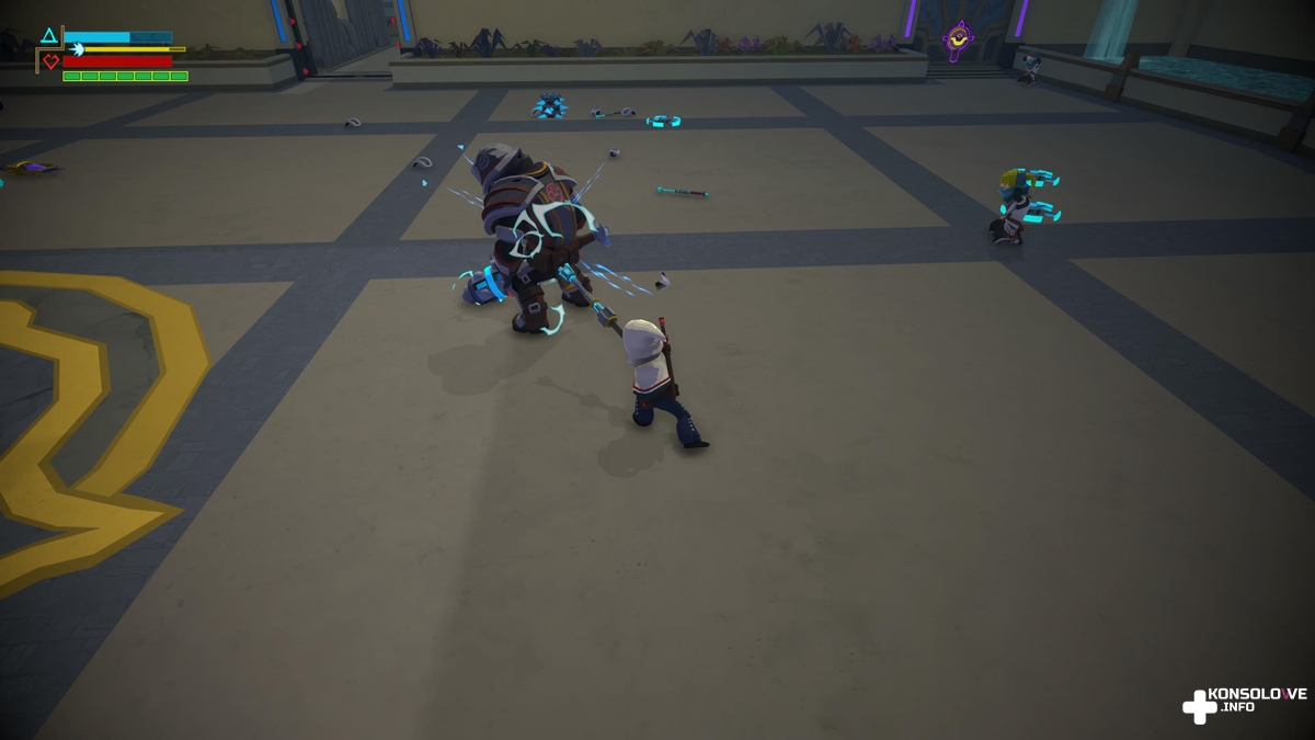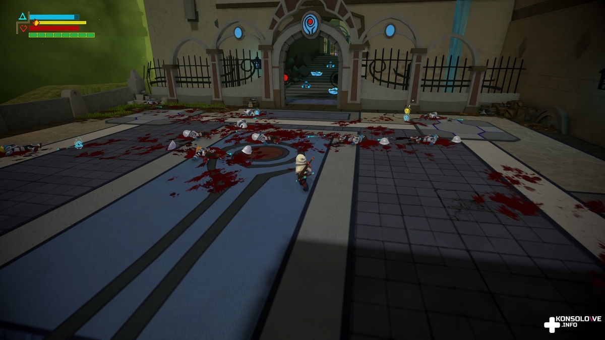 Jednym z najbardziej istotnych punktów przy opisywaniu dzieła Triple-I Games z całkowitą pewnością jest możliwość wybrania stylu walki. Naciskając lewy przycisk na d-padzie, przejdziemy do wyboru broni. Jeśli zdecydujemy się na niebieską lagę, będziemy mogli pozbyć się przeciwników bez zabijania ich. Wskazane będzie też przeskakiwanie od celu do celu – tylko w ten sposób najpełniej wykorzystamy tę pałkę. Alternatywnie możemy postawić na czerwony miecz. Po wyborze tego oręża przeciwnicy będą wręcz topili się w kałużach krwi. Warto też zaznaczyć, że Hindsght w żadnym razie nie jest grą dla dzieci. Zabicie przeciwnika wiąże się z rozryciem mu głowy, z której to następnie sączy się krew. Przemoc, mimo że dość karykaturalna – jak i cały świat – jest tu więc na porządku dziennym i trzeba mieć to na uwadze, rozważając zakup.