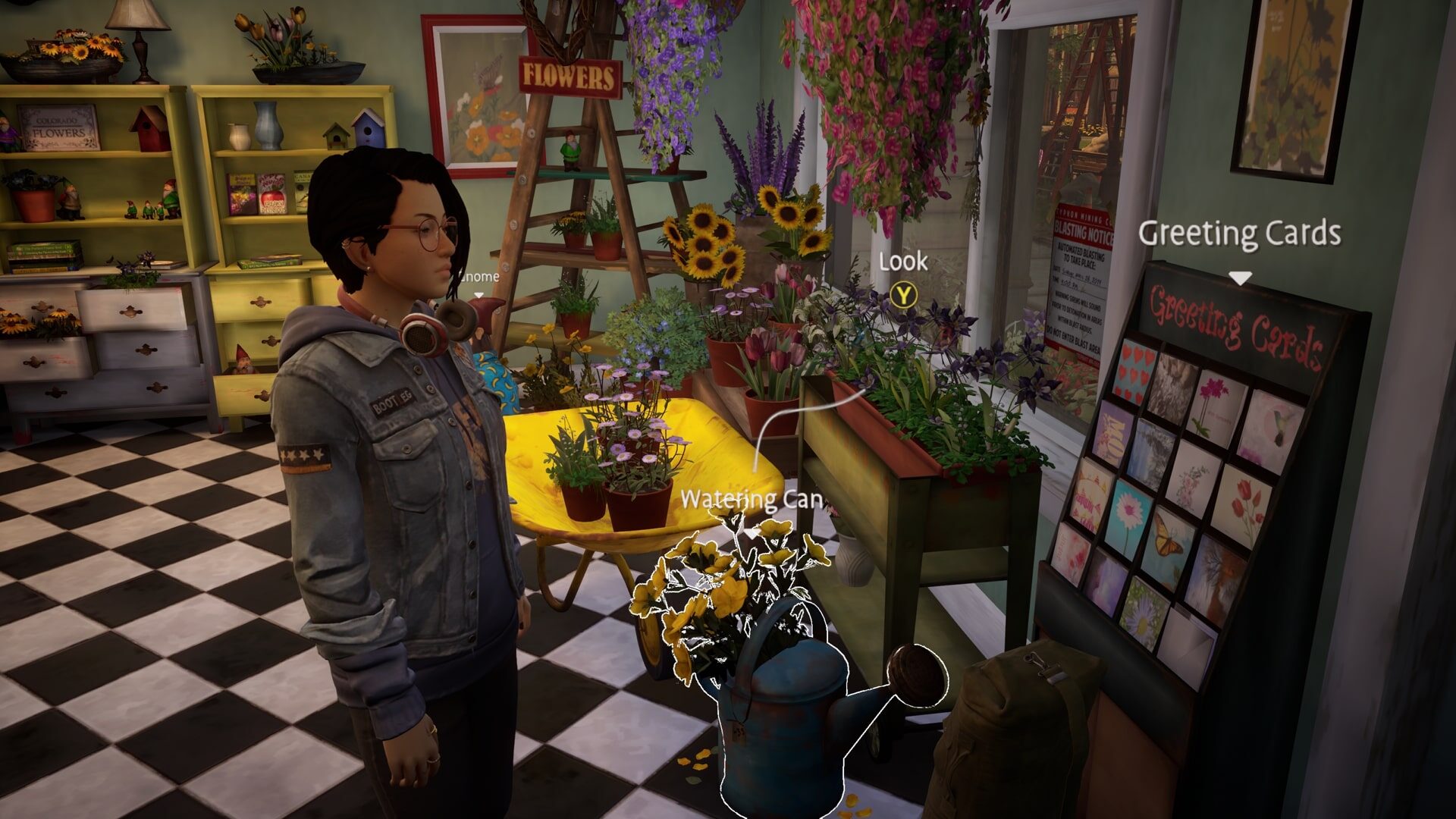 Wracając jednak do Life is Strange: True Colors — Colorado wygląda obłędnie. Nasze miasteczko ułożone jest pomiędzy górami, na których szczycie wciąż bieli się śnieg, a nas raczy ostre i ciepłe słońce. Pełno tu kolorów, kwiatów i światła. Wiele miejsc wręcz zalanych będzie kwiatami, a donice pełne kolorowych roślin znajdziemy wzdłuż całej głównej ulicy, nie wspominając już o moście, parku czy… kwiaciarni.