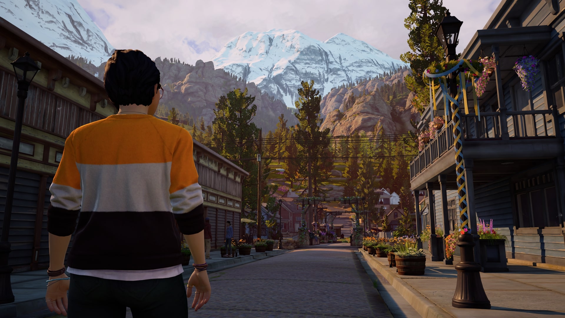Wracając jednak do Life is Strange: True Colors — Colorado wygląda obłędnie. Nasze miasteczko ułożone jest pomiędzy górami, na których szczycie wciąż bieli się śnieg, a nas raczy ostre i ciepłe słońce. Pełno tu kolorów, kwiatów i światła. Wiele miejsc wręcz zalanych będzie kwiatami, a donice pełne kolorowych roślin znajdziemy wzdłuż całej głównej ulicy, nie wspominając już o moście, parku czy… kwiaciarni.