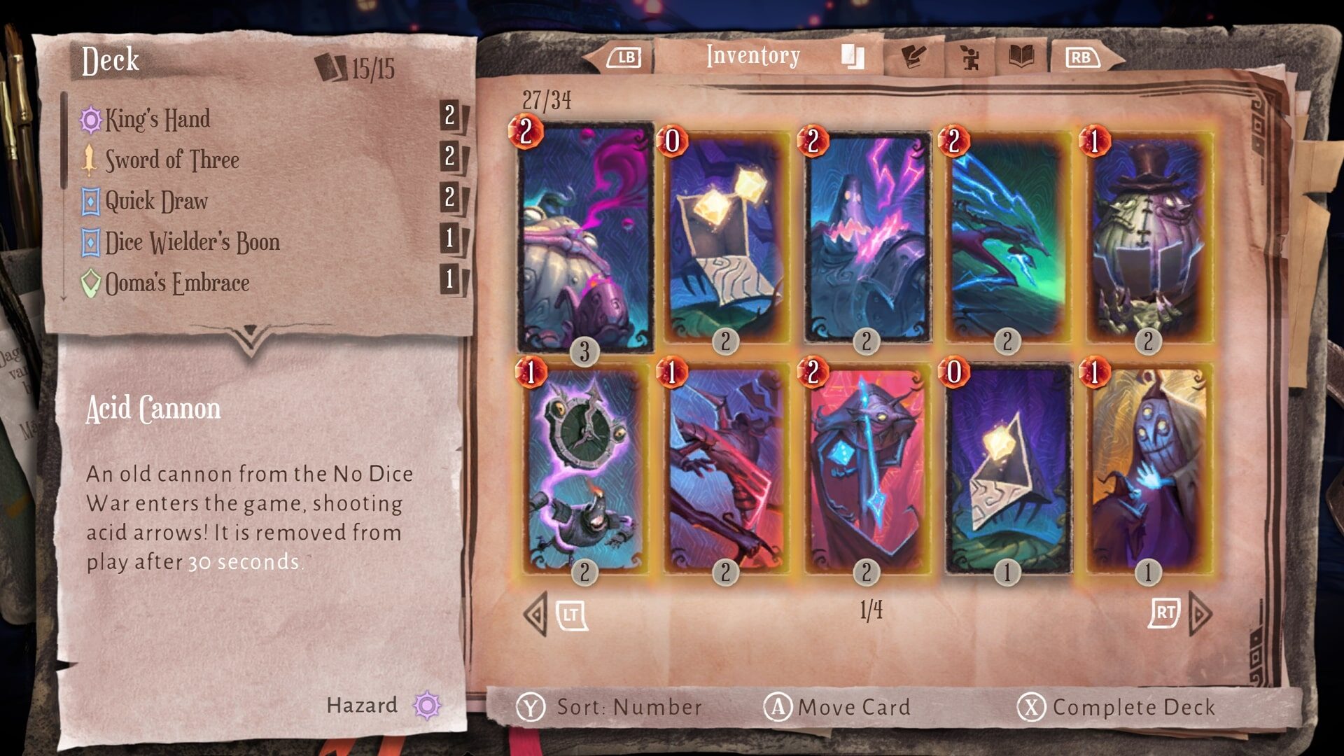 Dicey’ego rzucić możemy w dowolnym momencie, gdy mamy energii na chociaż jedną kartę, choć dopiero przy pełnym komplecie pięciu wyskoczy nam na ekranie przypomnienie. Im więcej kart będziemy mieli do dyspozycji, tym lepiej oczywiście. Szczególnie, że karty z kategorii Oszustwo nie mają sensu w pojedynkę.