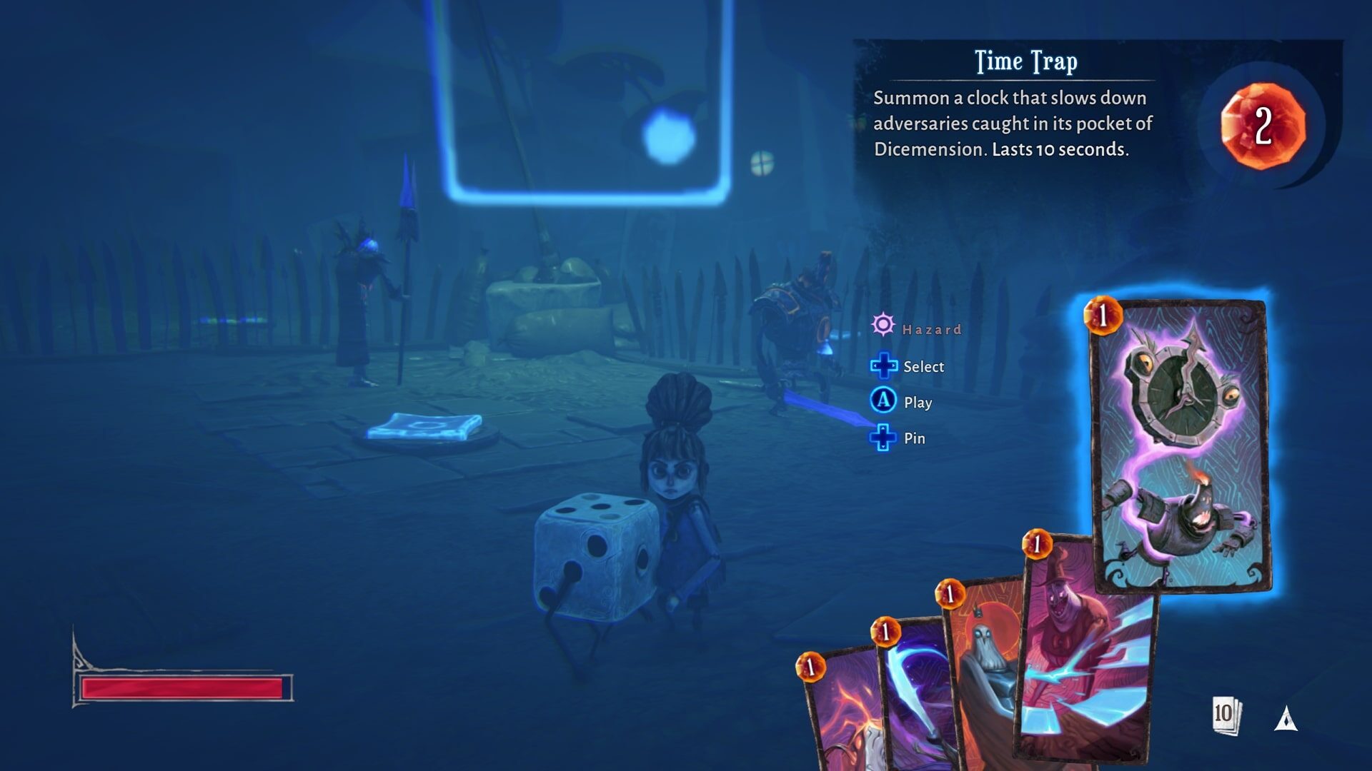 I tak, nasz deck ma 15 kart, maksymalnie możemy wylosować pięć, spośród których aktywujemy te, na które faktycznie mamy „fundusze”. Oczywiście ograniczać nas będzie ilość oczek na Dicey’im. Szybko zauważycie, że na drugim poziomie ta liczba to maksymalnie dwa, na trzecim trzy i tak dalej. Na szczęście Oszustwa pomogą Wam trochę zarządzać ograniczonym budżetem. Nieużyte karty chowamy dalej do ręki i będą dostępne dopiero wtedy, gdy przerobimy całą piętnastkę — postęp tego znajdziecie w prawym dolnym rogu ekranu walki.