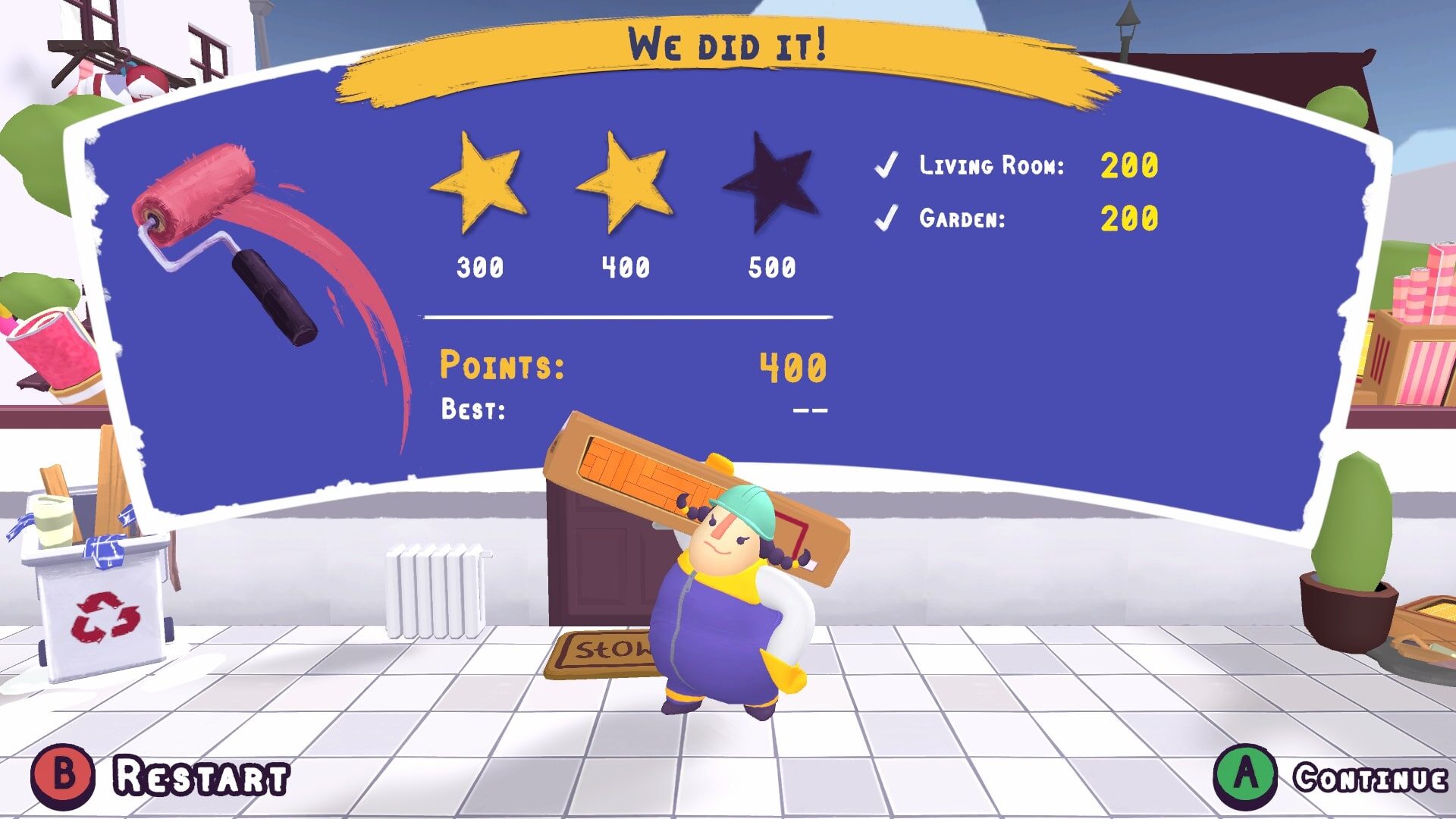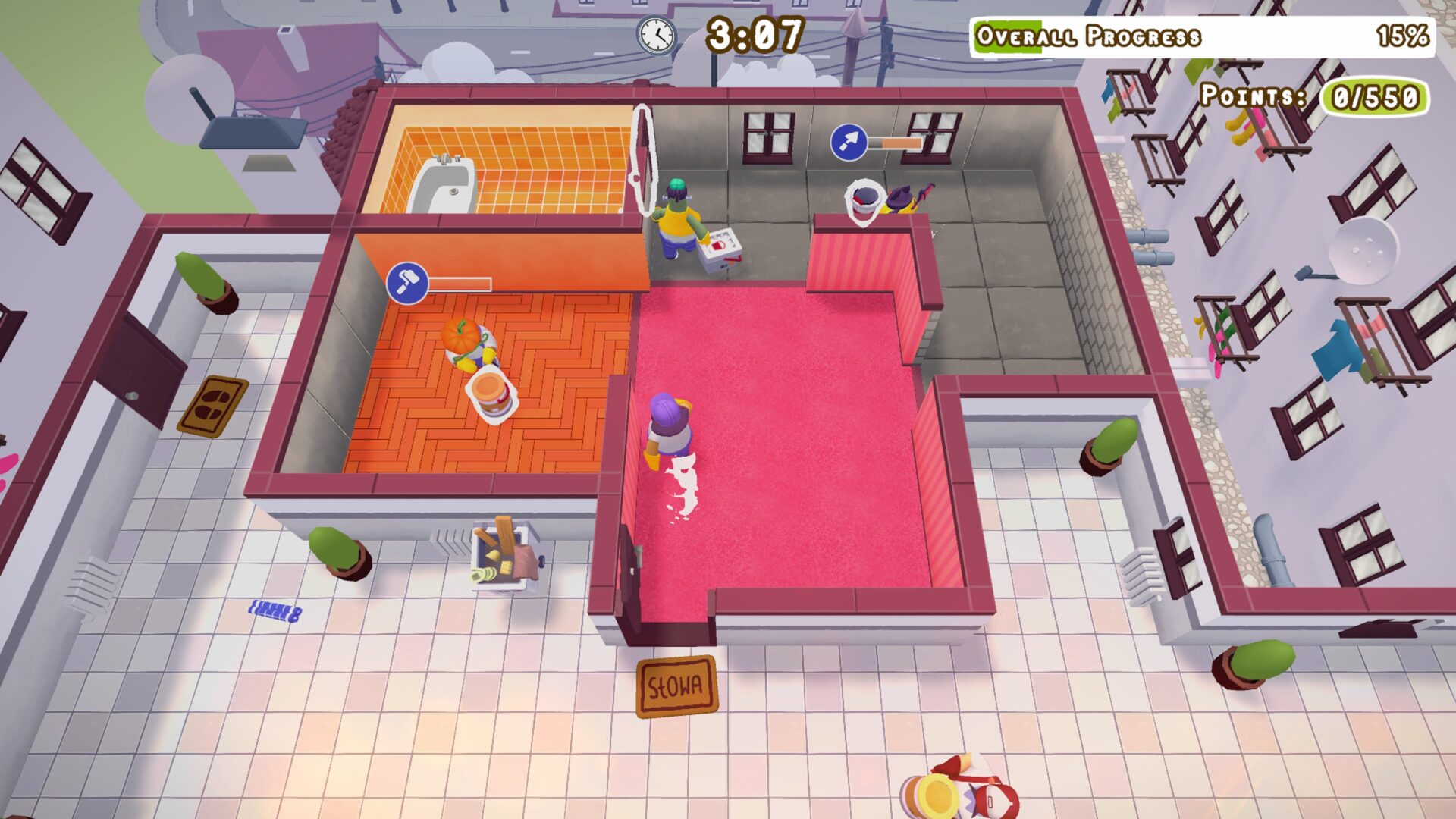 O ile w Overcooked (co chyba od razu przychodzi na myśl, gdy widzimy tego typu grę?) rozgrywka samemu jest wyraźnie trudniejsza, tak tutaj… nie jest tak źle. Na wykonanie pokoi mamy znacznie więcej czasu, a fakt, że nie trzeba się dzielić jednym wiadrem z innymi graczami, czy przejmować tym, by zmieścić się w drzwiach, jest całkiem przyjemny. Optymalną liczbą graczy byłoby chyba dwoje? Przynajmniej nie trzeba by się było odrywać od zdzierania podłóg, gdy przychodzi dostawa.