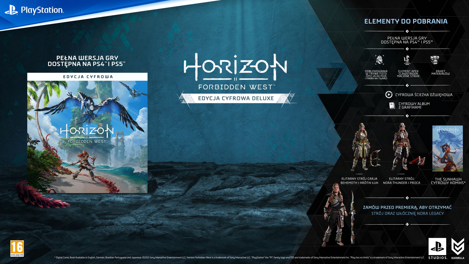 Firma Sony Interactive Entertainment informuje, że już od dzisiaj każdy może zakupić w przedsprzedaży Horizon Forbidden West. Nadchodzący tytuł studia Gueriilla zadebiutuje 18 lutego 2022 roku i będzie dostępy wyłącznie na konsole PlayStation 4 oraz PlayStation 5.