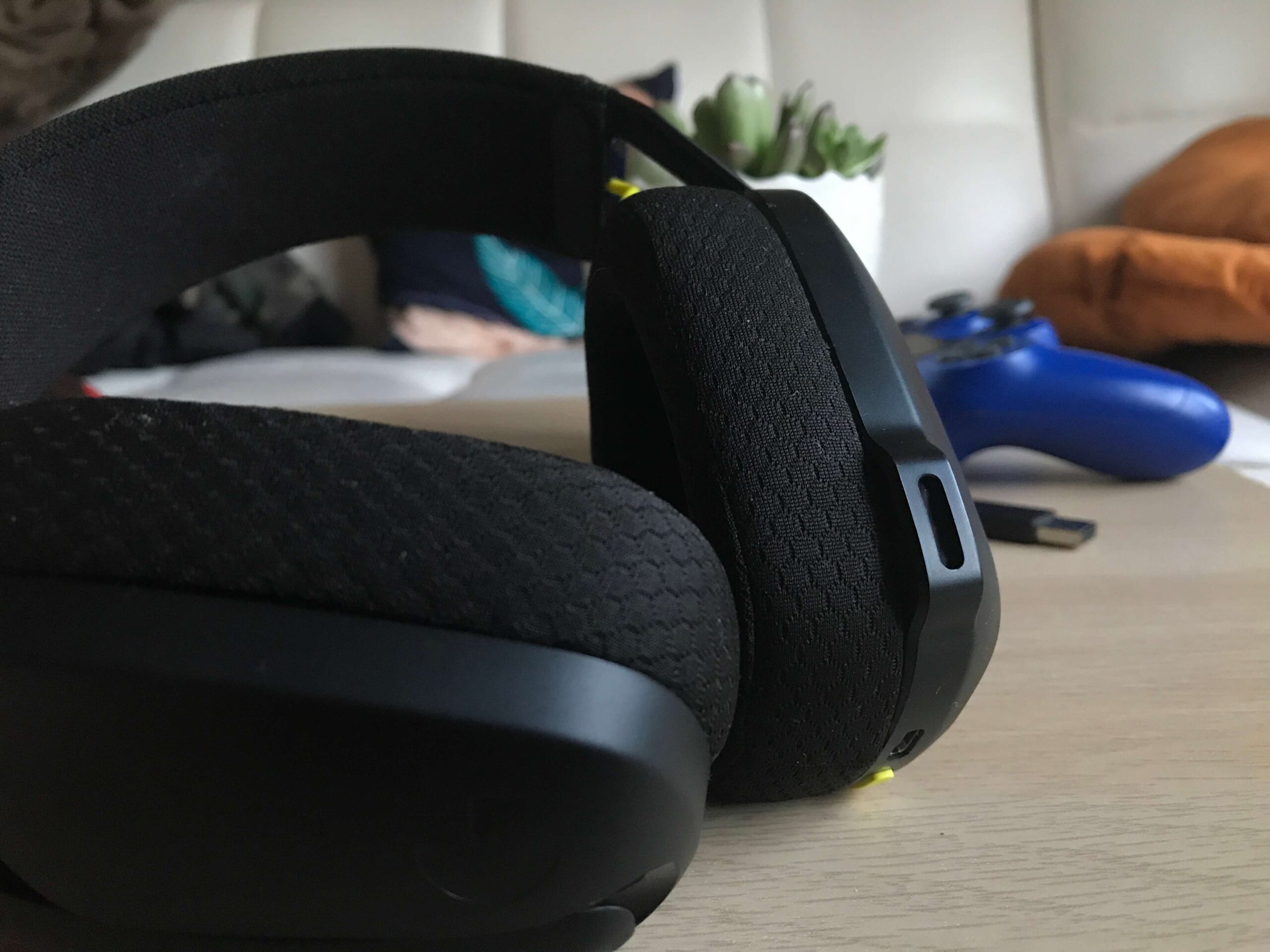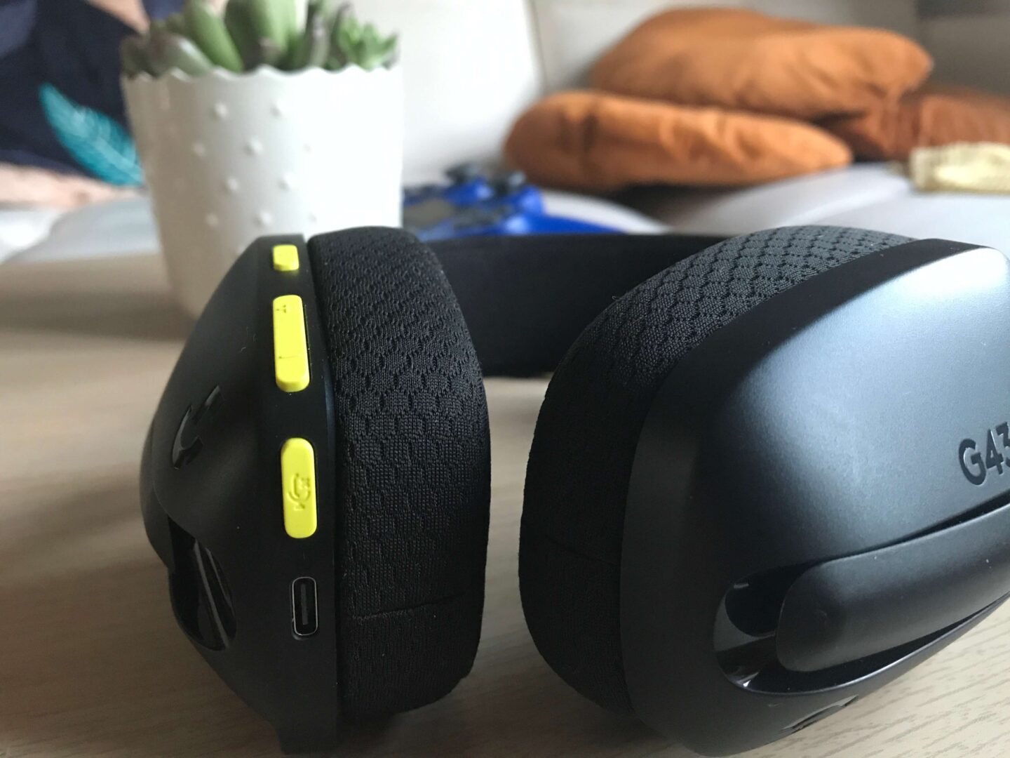 Samych przycisków mamy cztery: wyciszenie mikrofonu, głośność w górę i w dół oraz przycisk włączający. Tu znów mamy różnicę w stosunku do G733 — przycisk wyciszenia i wyłączenia słuchawek jest w odwrotnej pozycji, a głośność regulujemy skokowo, zamiast na pokrętle. Oczywiście to “mankamenty” tylko dla mnie. Przyciski nadal ustawione są bardzo wygodnie.