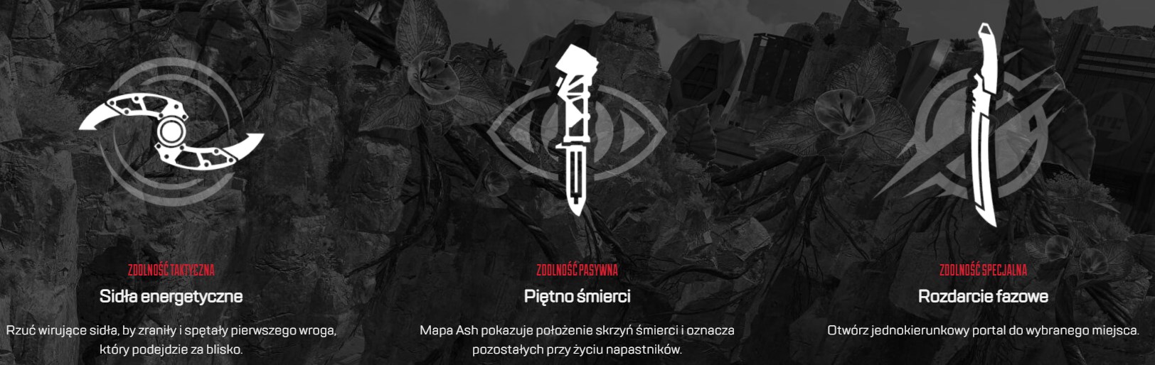 Nowa legenda Ash: Symulakrum stworzone z kobiety znanej niegdyś jako Dr Ashleigh Reid – Ash, wyczuwa śmierć, gdziekolwiek się uda, przygwożdżając przeciwników elektrycznymi sidłami i blokując ich ruchy oraz przedziera się przez przestrzeń aby odebrać więcej żyć. Łatwo byłoby założyć, że w tej zimnej stalowej konstrukcji nie pozostało nic z człowieczeństwa.