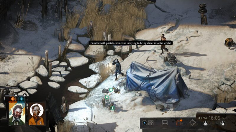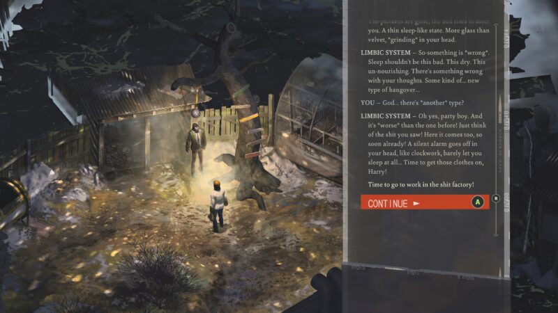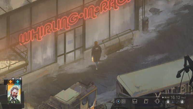 Jak zobaczycie na zrzutach ekranu, gra wygląda niesamowicie. Jest klimatyczna, pełna detali i całość po prostu robi wrażenie. Zmieniająca się pogoda będzie wpływać na otoczenie, podobnie upływający czas. Bo wiecie, w Disco Elysium leci czas. Od 21 miasteczko zaczyna się wyludniać, a my możemy iść spać, od 2 w nocy na mieście nie zobaczymy już nikogo. Nasza postać wciąż może eksplorować, choć rzadko o tak późnej porze popchniemy jakieś zadania.