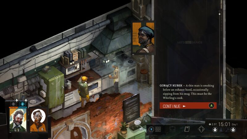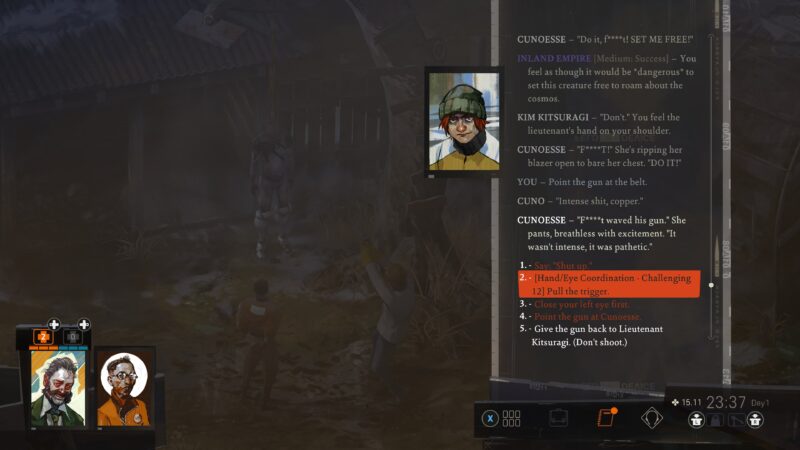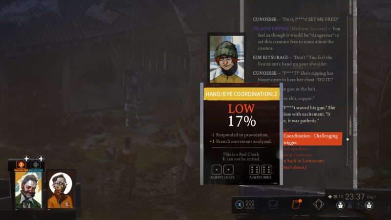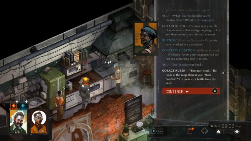 Większość rozgrywki w Disco Elysium to rozmowy. Mnóstwo rozmów. Część będzie konieczna, część pozwoli nam bardziej poznać świat. Integralną częścią rozmów, będą ważniejsze interakcje, dostosowane do naszej postaci. Wiecie, zeznania od świadków możemy wyciągnąć siłą lub postawić na wysoką empatię. Gdy nadarzy się okazja na wykorzystanie umiejętności, pojawi się informacja o tym, czego potrzebujemy, jak trudne to jest aktualnie i jakie mamy szanse na powodzenie. Gdy zdecydujemy się spróbować, gra rzuci kośćmi, których wyższy wynik zadecyduje o tym, czy nam się udało.