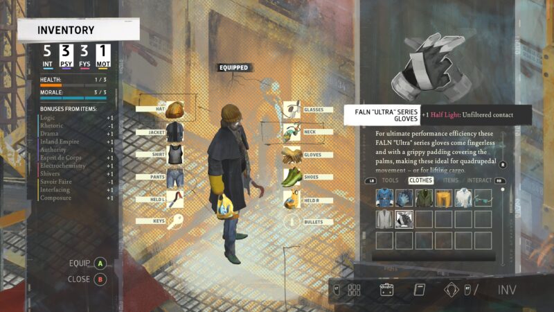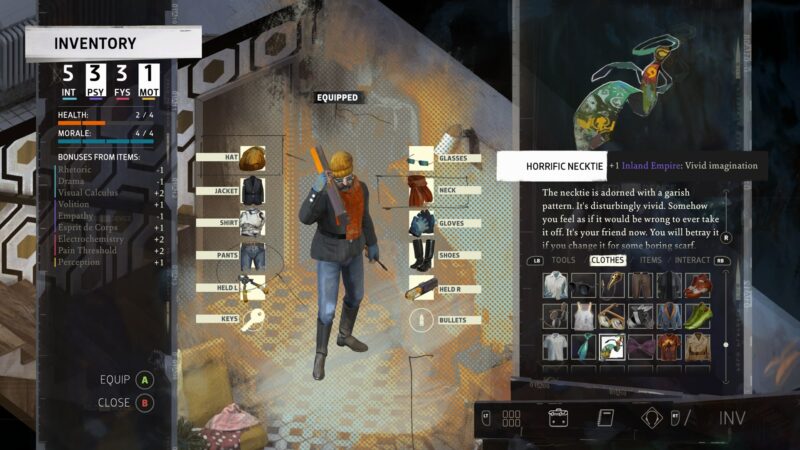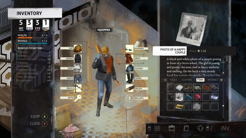 To też niesamowicie rozbudowany RPG. Mnóstwo cech i miejsc, gdzie można wsadzić punkty. Ubrania, które wpływają na nasze statystyki i system myśli, które po opracowaniu dają nam różne bonusy. Oprócz tego mamy kilka możliwości ulepszenia samych siebie, są przedmioty które podbiją nasze punkty zdrowia czy morale, a także podniosą limit w punktach, które możemy przydzielić cechom. Musimy tylko pamiętać, że każda akcja będzie mieć konsekwencje, a szprycowanie się alkoholem czy narkotykami na co dzień, nie koniecznie będzie najlepszą drogą.